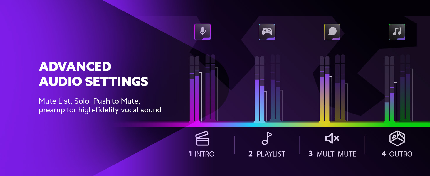 - Mixer with built-in audio, advanced audio features: Mute List, Solo, Push to Mute, preamp for high-fidelity vocal sound