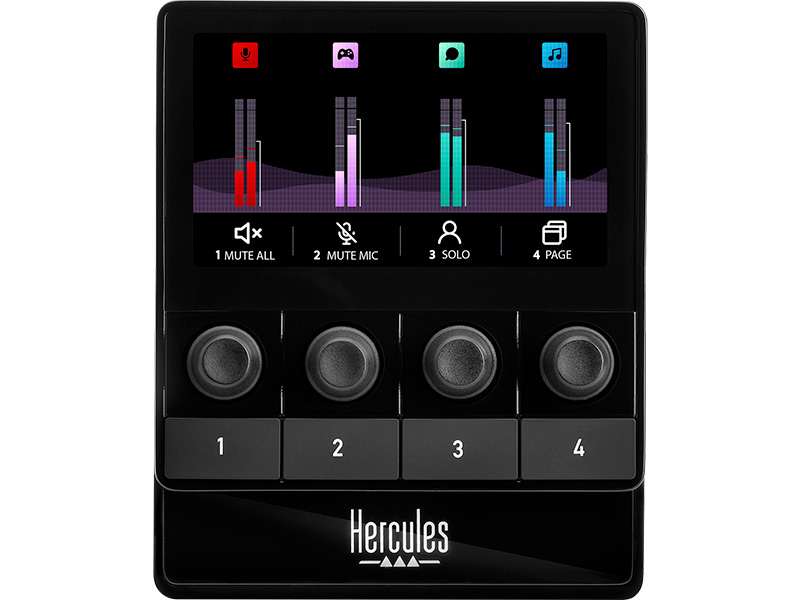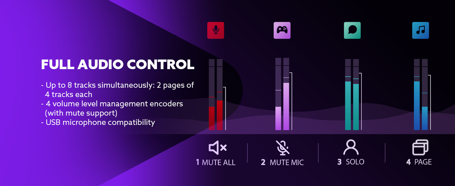 - Complete management of your audio: audio source configuration via software, up to 8 tracks simultaneously, 2 pages of 4 tracks each, 4 volume level management encoders (with mute support), USB microphone compatibility