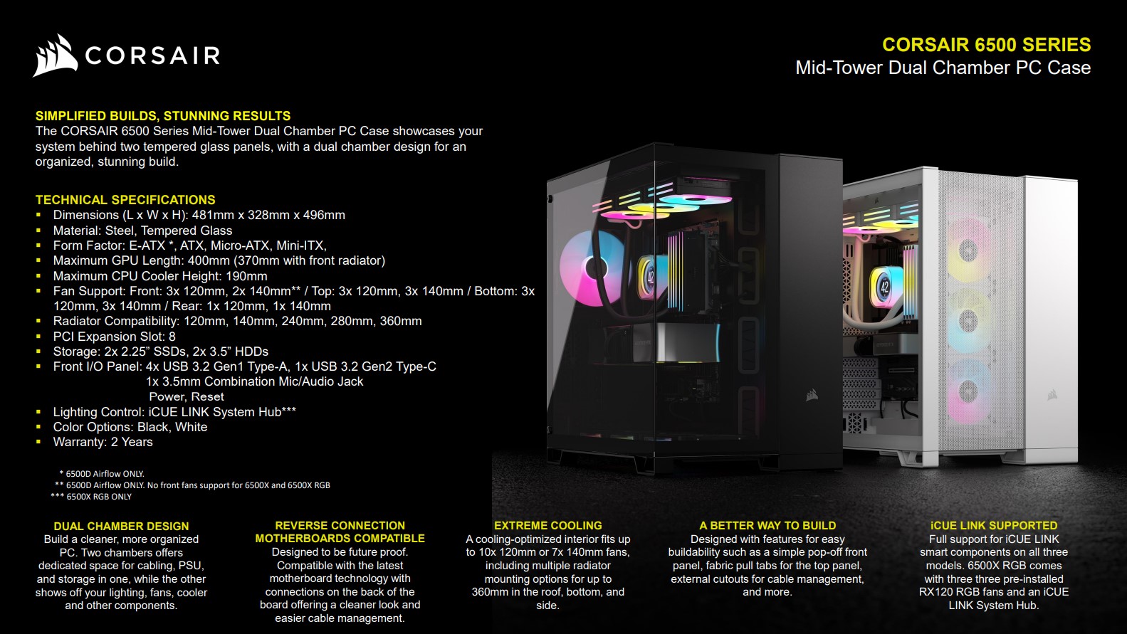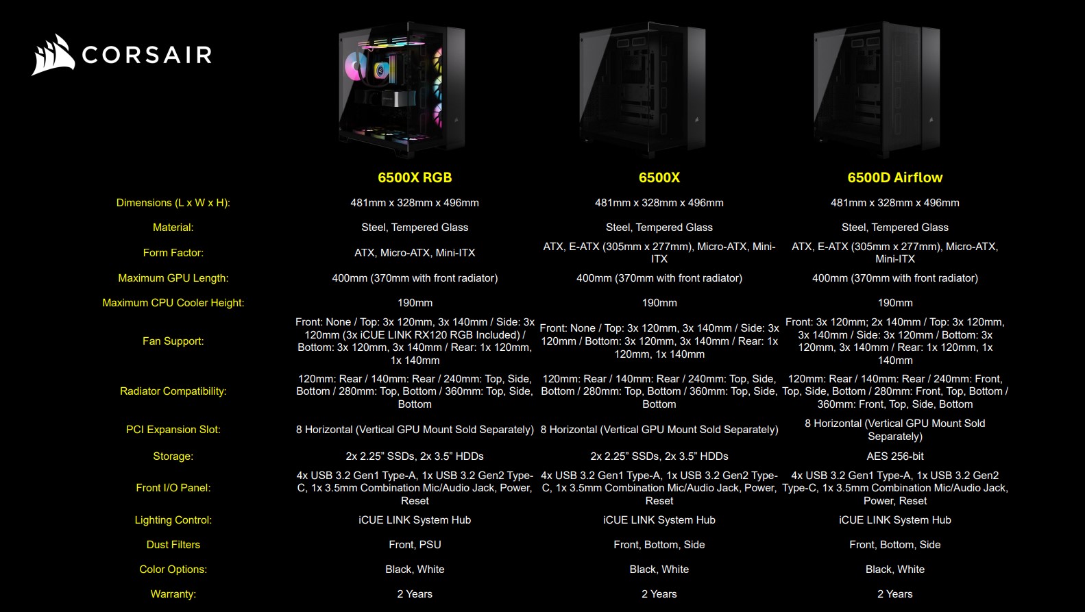 Full support for iCUE LINK smart components on all three models. 6500X RGB comes with three three pre-installed RX120 RGB fans and an iCUE LINK System Hub.