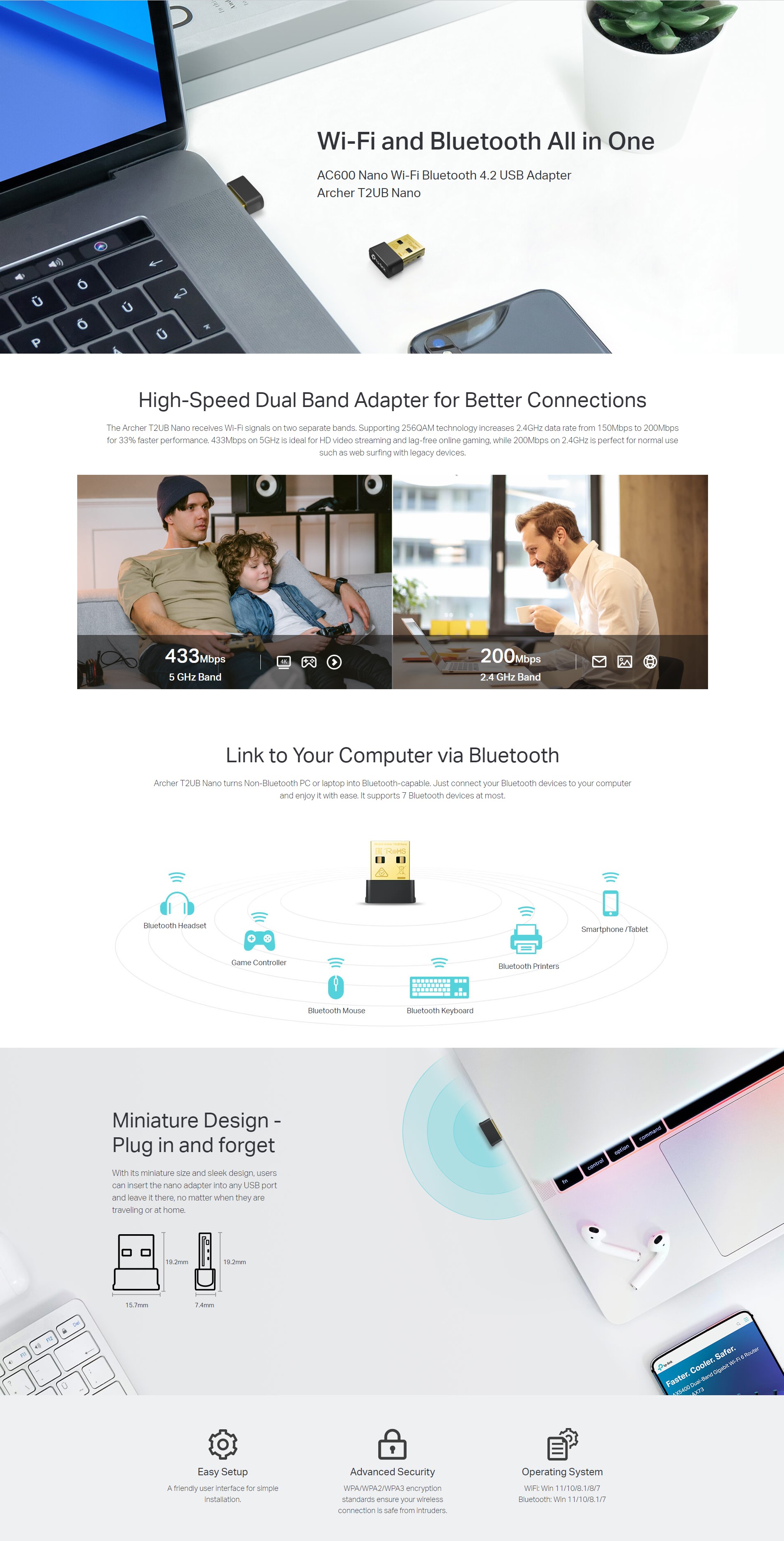 AC600 Nano Wi-Fi Bluetooth 4.2 USB Adapter Archer T2UB Nano