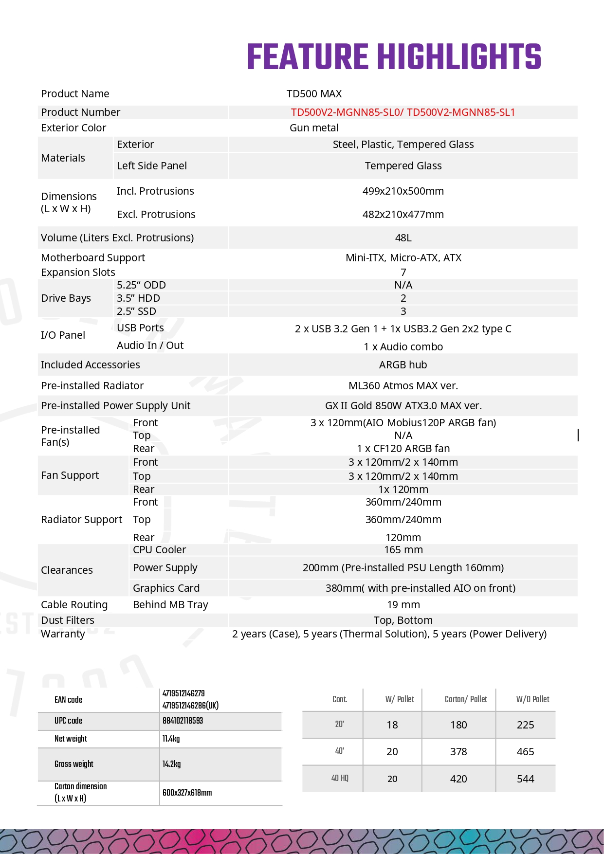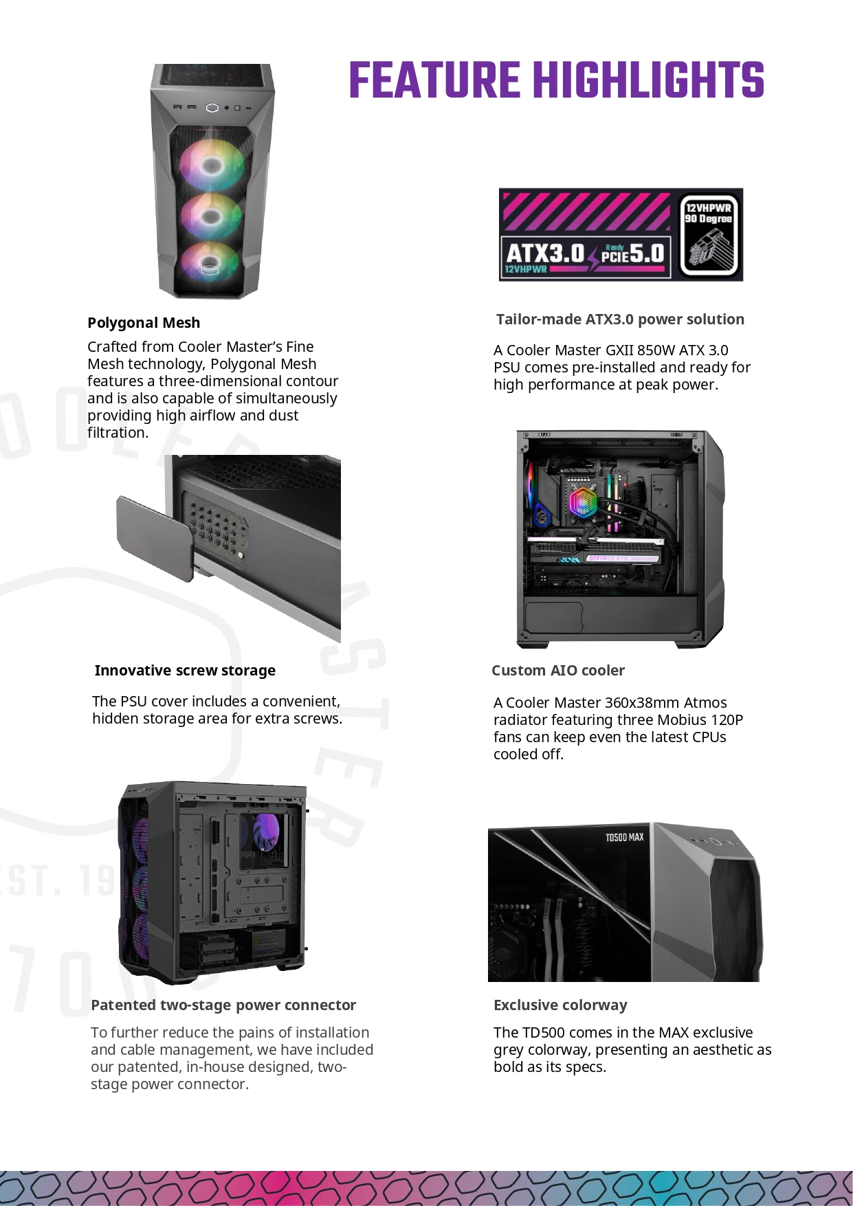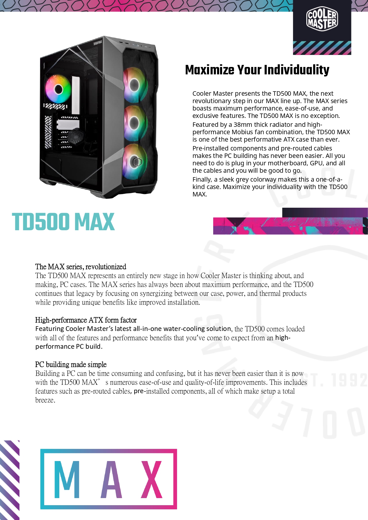 TD500 MAX 是 Cooler Master MAX 系列中的首款 ATX 機箱,預裝定製的 AIO 散熱器、GXII Gold 850W ATX 3.0 PSU、專利的 2 級電纜聯結器和螺絲儲存墊。