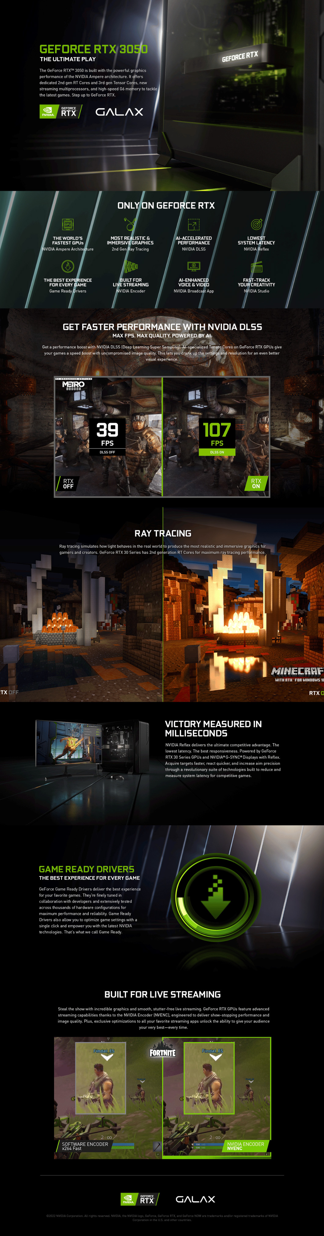 GALAX GeForce RTX™ 3050 6GB LP White features 6GB high speed GDDR6 memory(96-bit) and 2304 CUDA cores, GALAX GeForce RTX™ 3050 6GB LP White is equipped with two 40mm fans. On top of the boost clock speed of 1470MHz, a higher boost clock speed of 1485MHz can be achieved through the use of GALAX’s unique 1-Click OC.
