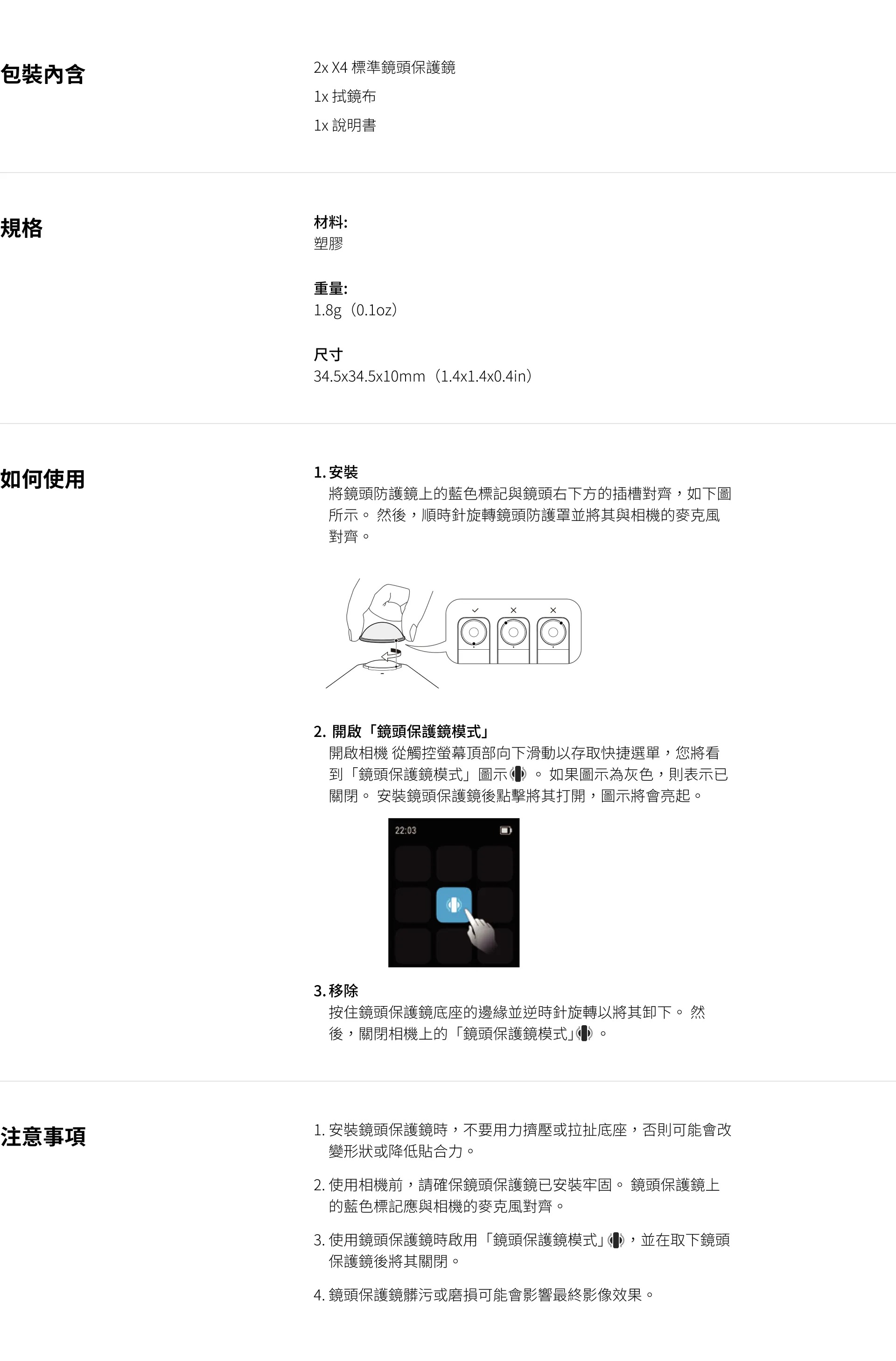 - 為 X4 鏡頭提供專門保護,防止灰塵、刮傷和日常使用。