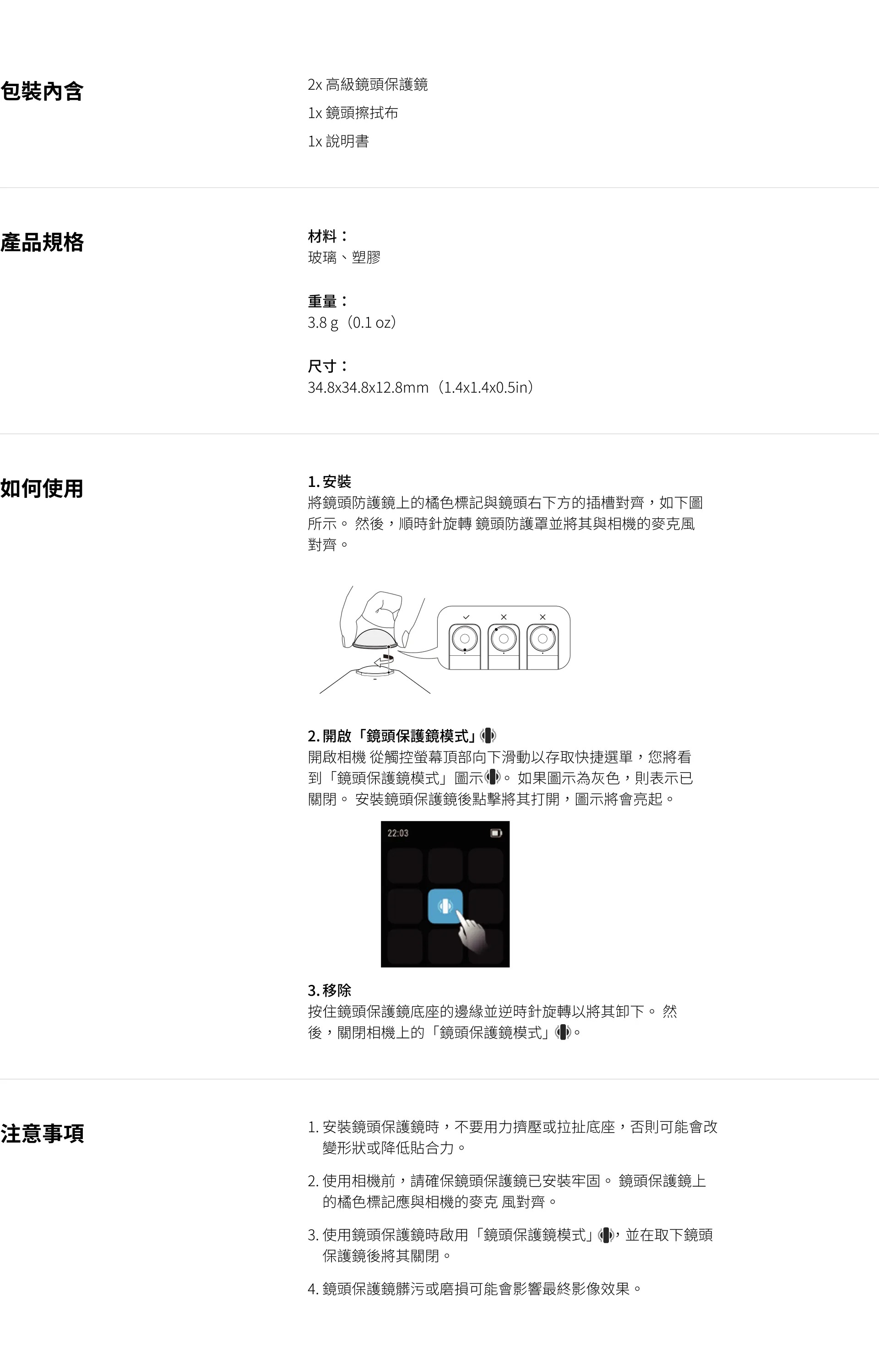 - 堅固且易於使用的強化玻璃鏡頭保護鏡可全面防止碰撞和刮擦。