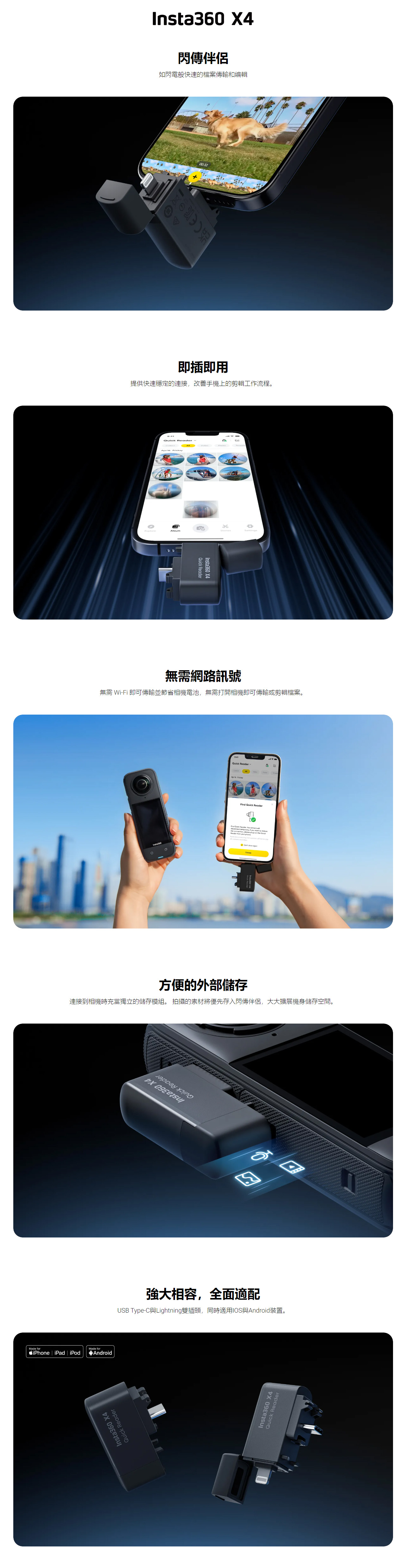 - 直接連接您的手機,顯著改善 Insta360 App 體驗。