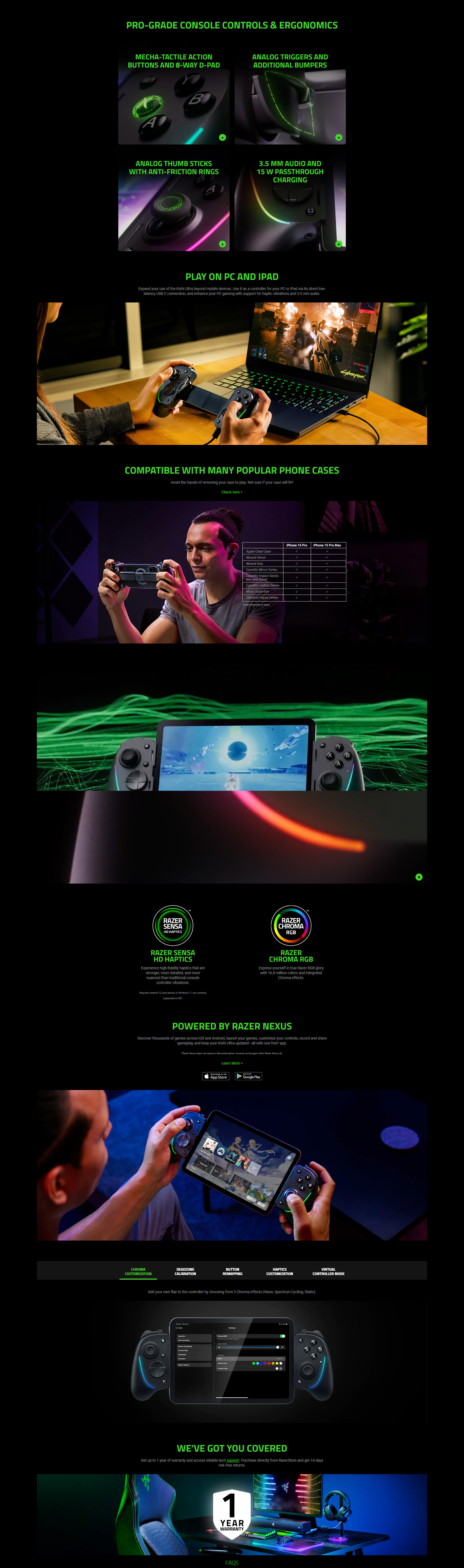 Enter a new era of mobile gaming with the power of a full-fledged pro console controller. The Razer Kishi Ultra forges into new terrain as the greatest mobile controller ever created. Meticulously designed with console-class ergonomics, immersive haptics, and Razer Chroma RGB, enjoy a true console gaming experience on mobile with zero compromise.