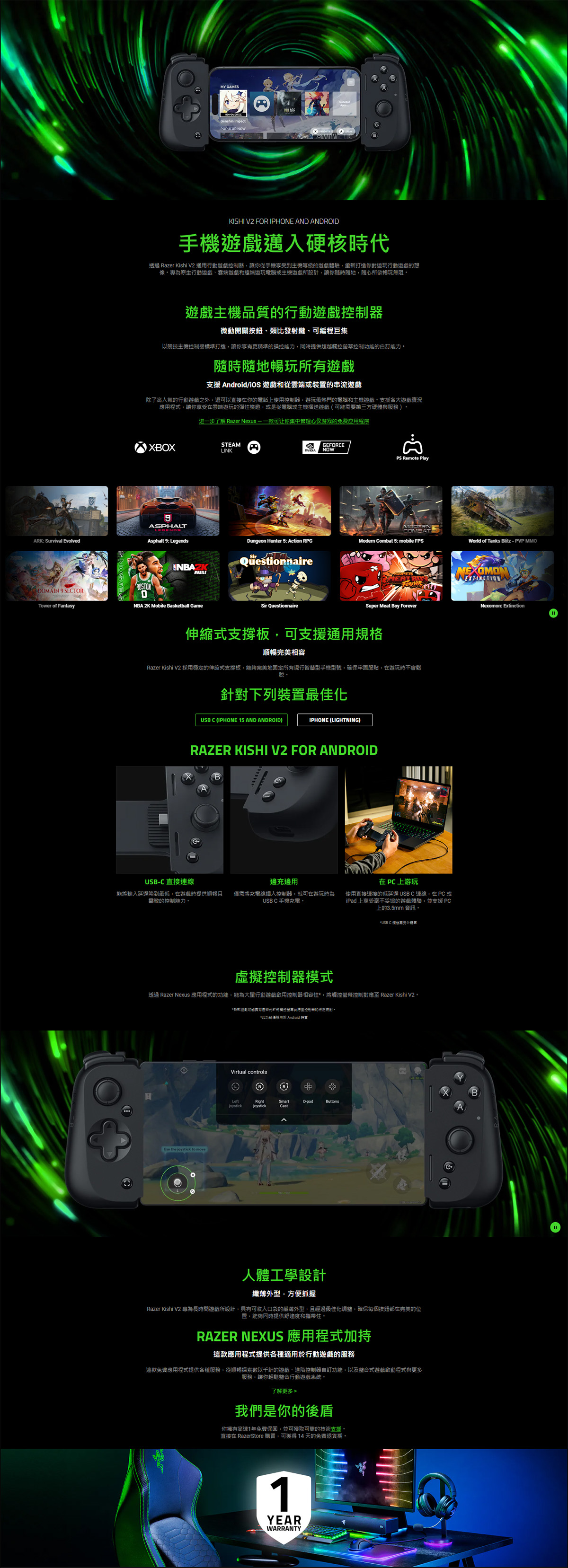 透過 Razer Kishi V2 通用行動遊戲控制器,讓你從手機享受到主機等級的遊戲體驗,重新打造你對遊玩行動遊戲的想像。專為原生行動遊戲、雲端遊戲和遠端遊玩電腦或主機遊戲所設計,讓你隨時隨地,隨心所欲暢玩無阻。