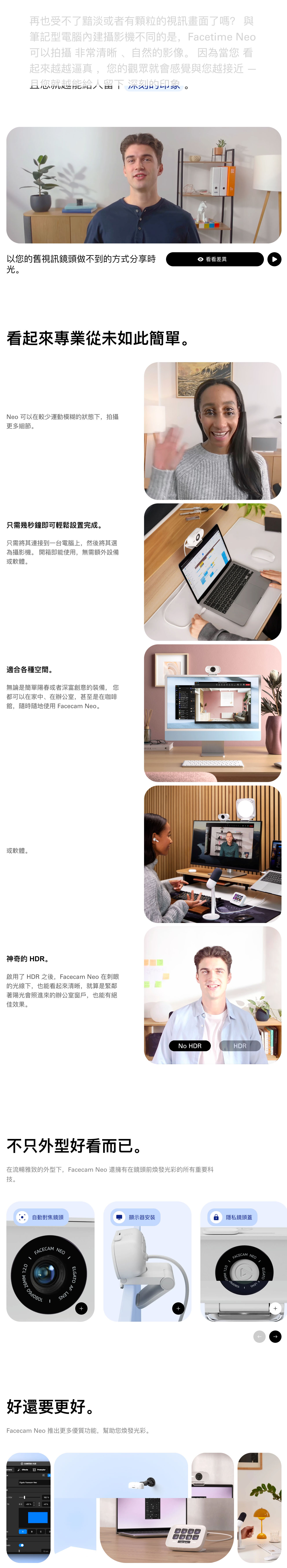 隨插即用的 Facecam Neo 視訊鏡頭可以無比流暢的 1080p60 超高畫質拍攝令人嘆為觀止的視訊會議、影片或者串流。 輕鬆快速、立即設置,立顯無比專業。