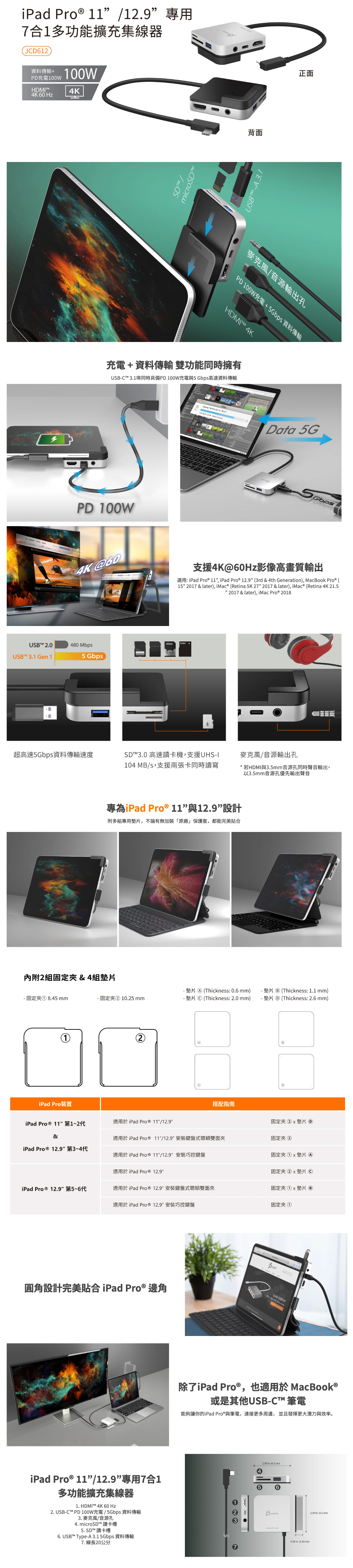 JCD612為7合1多功能擴充轉接器,專為iPad Pro而生。特殊的造型設計,可置於iPad Pro頂角,隨附四組專用墊片,