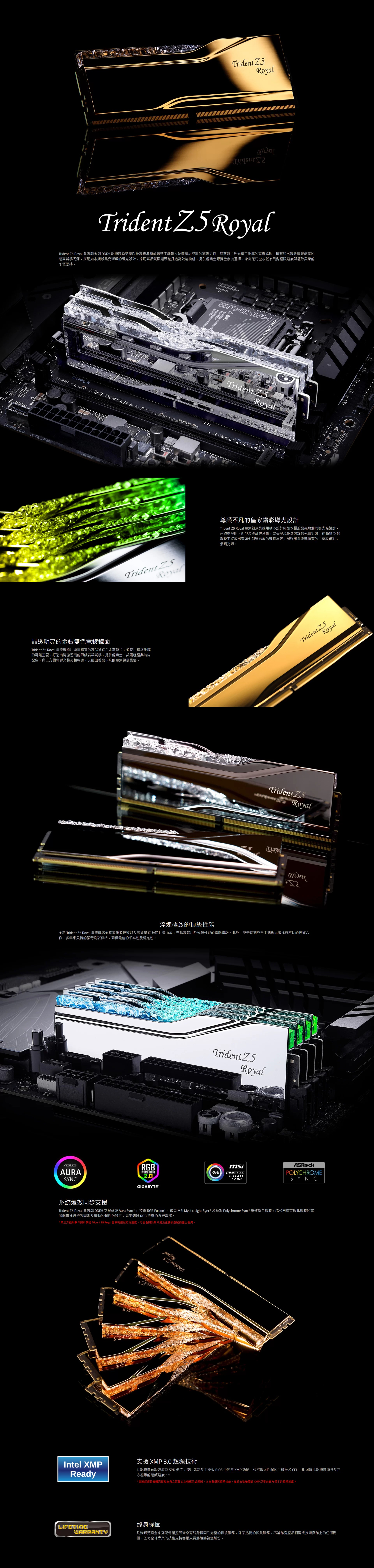 - Trident Z5 Royal 系列,專為 Intel 700/800 系列晶片組設計,配備 13/14 代 Intel Core 系列 CPU 或 Intel Core Ultra 200 系列 CPU
