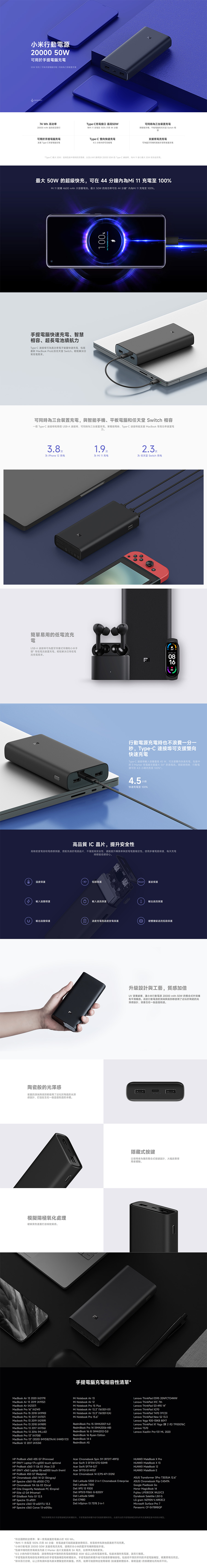 小米行動電源 20000 50W x1充電線 (雙向type-c接頭)×1使用者手冊 ×1