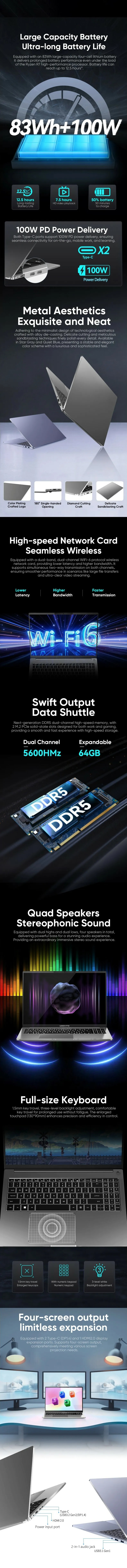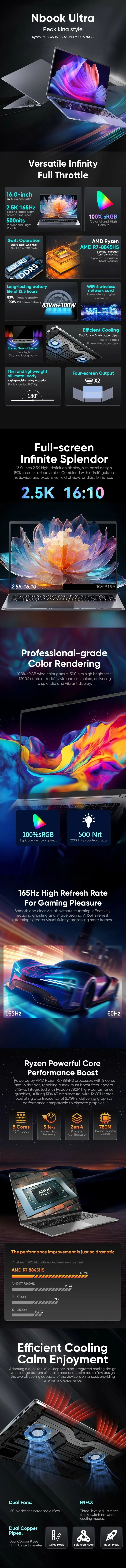 - N-one NBook Ultra 16-inch Laptop, 2560 x1600 165Hz Screen, AMD Ryzen R7 8845HS 8 Cores Up to 5.10GHz, 32GB RAM, 1TB SSD, WiFi 6 Bluetooth 5.2, 2 x Full Function USB Type-C, 2 x USB 3.1, 1 x HDMI , 1 x 2-in-1 Headphone Jack, Full-size Keyboard, 100W PD Power Delivery.