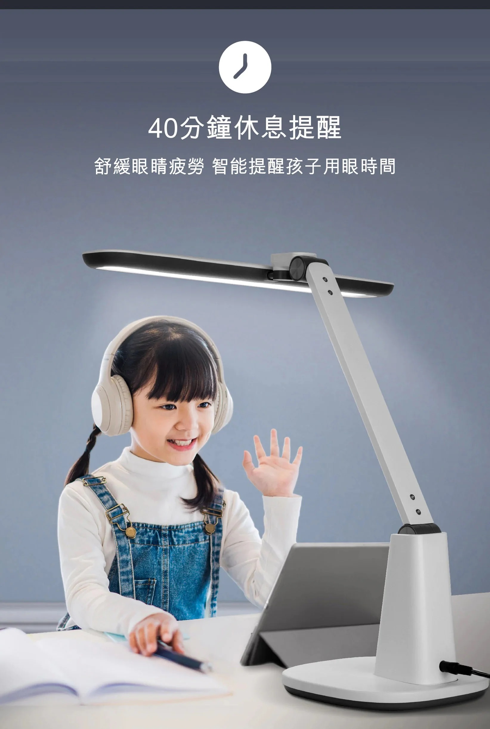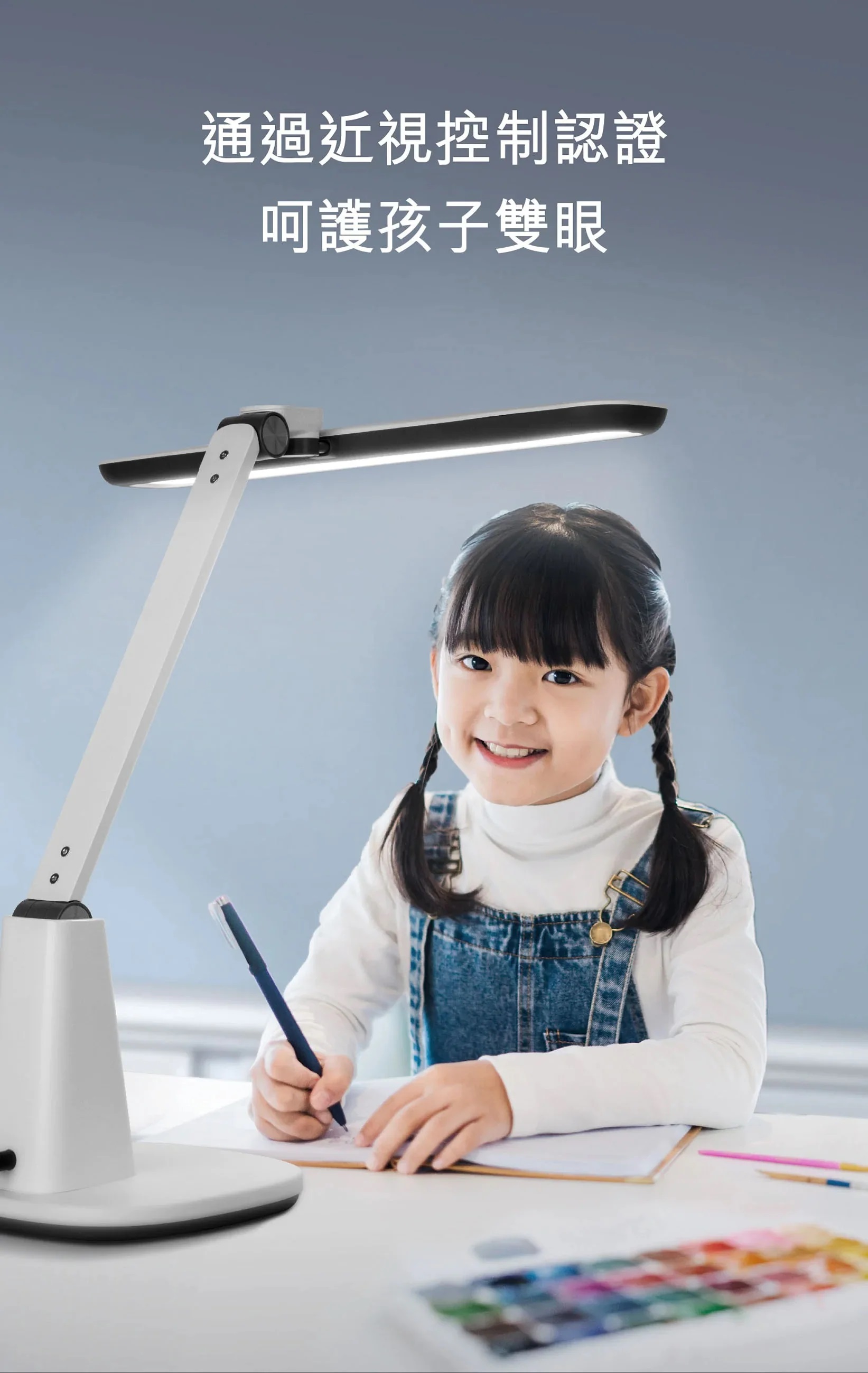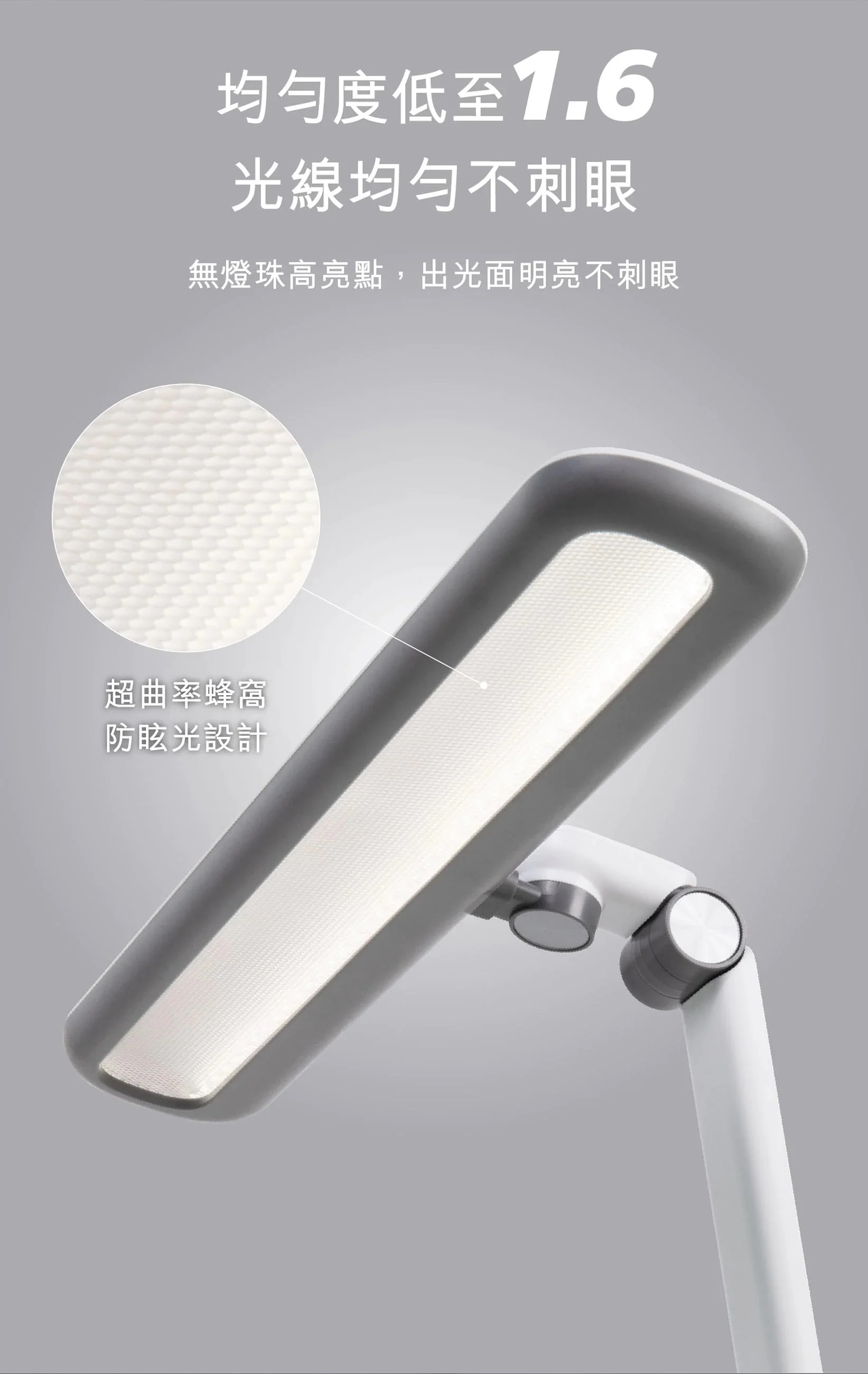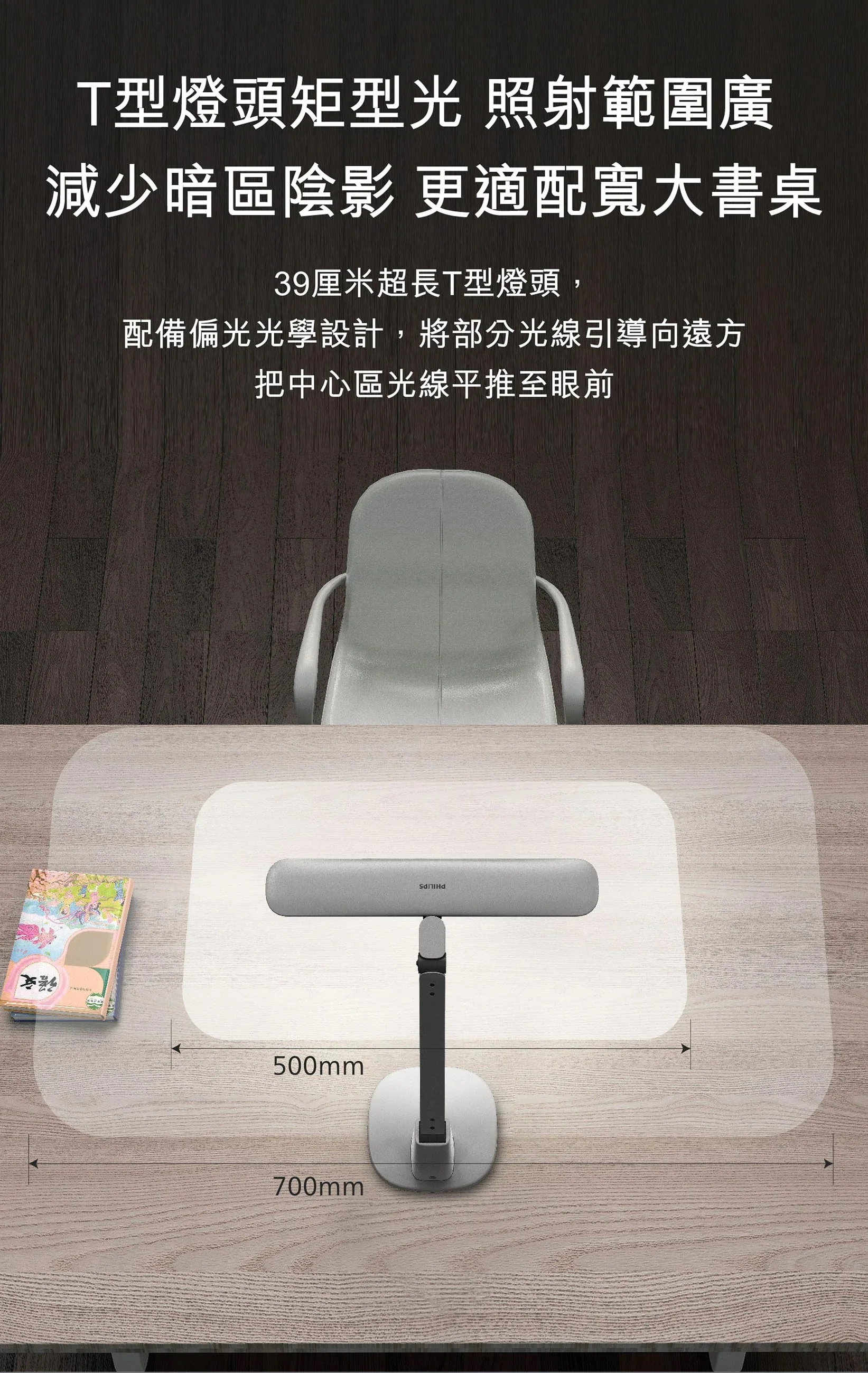 - T 型燈頭採用 二維懸臂結構,適配寬書桌,可將中心區光線平推至孩子眼前。