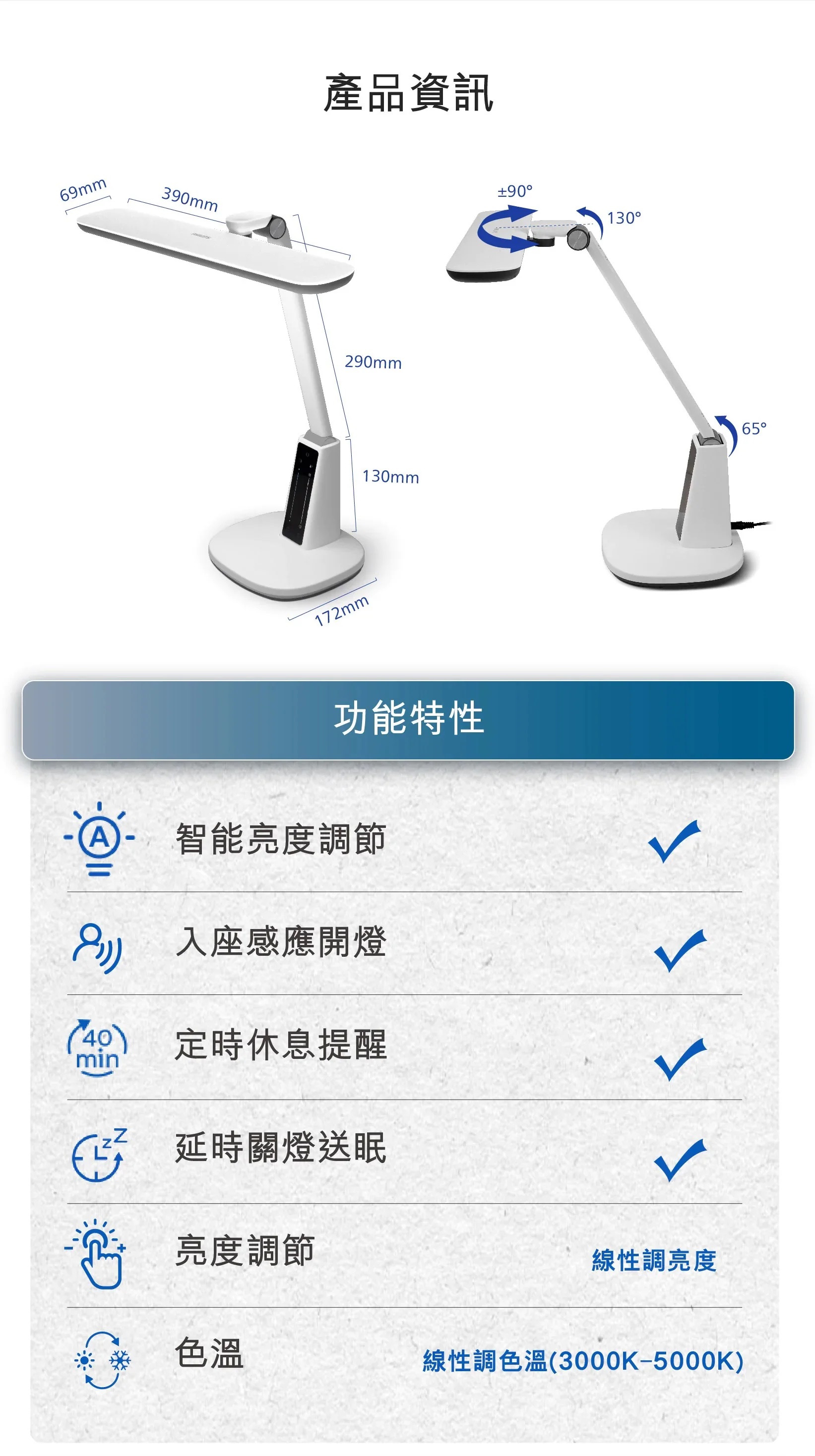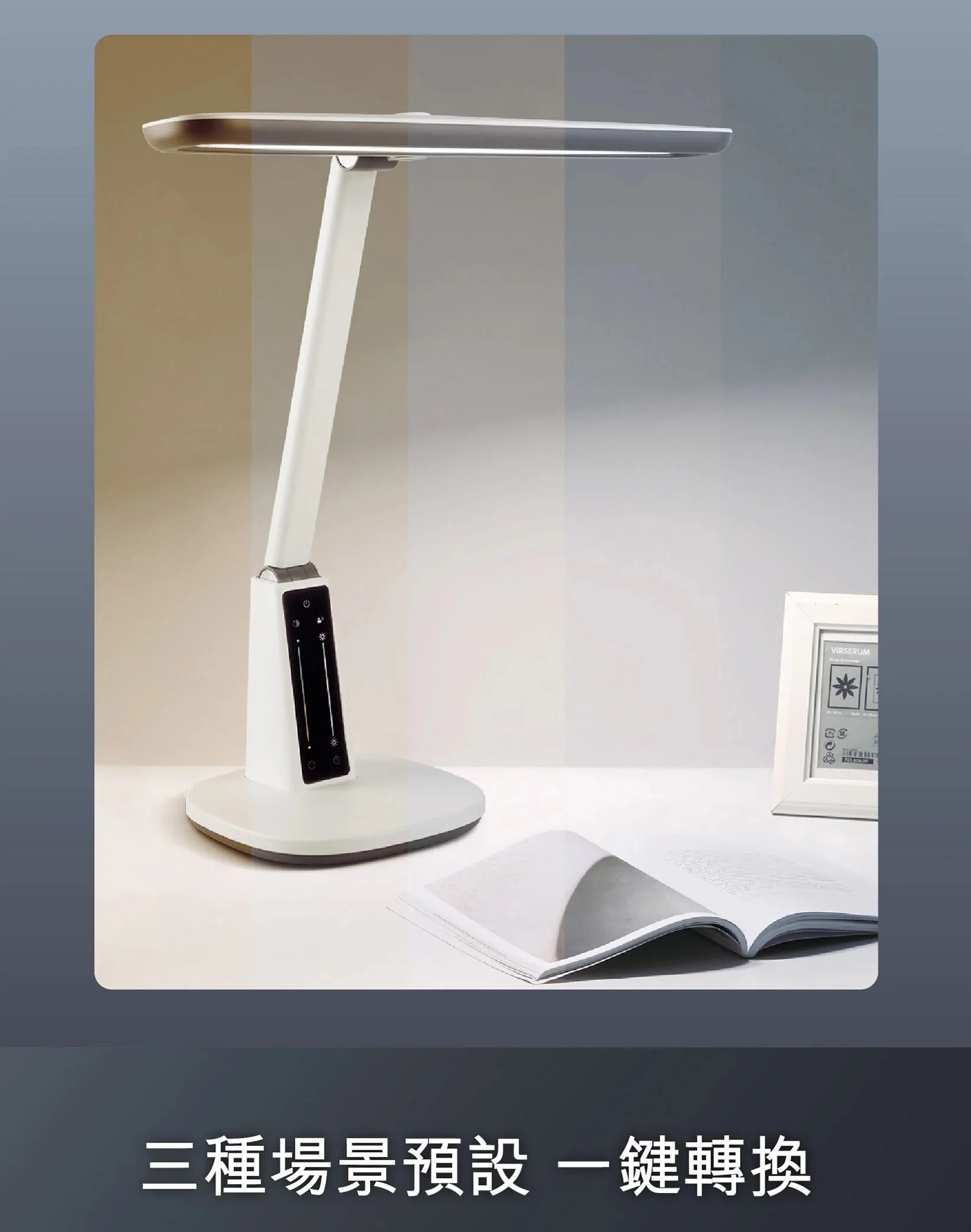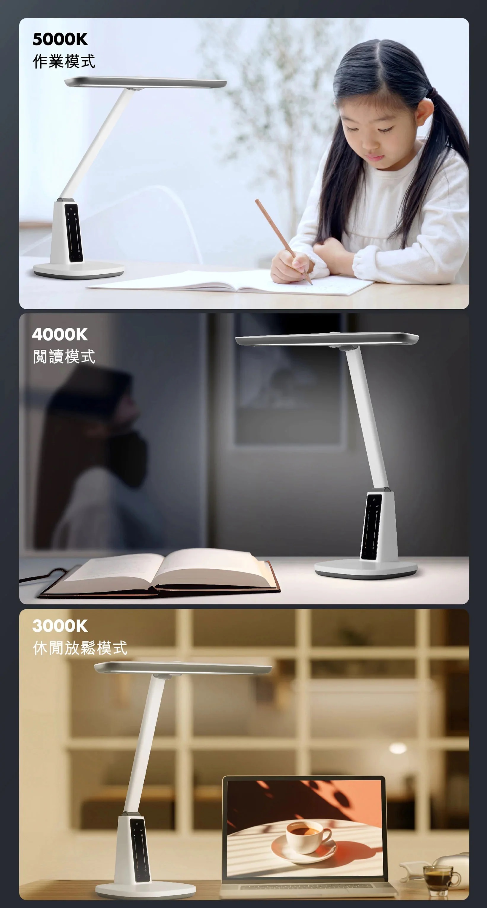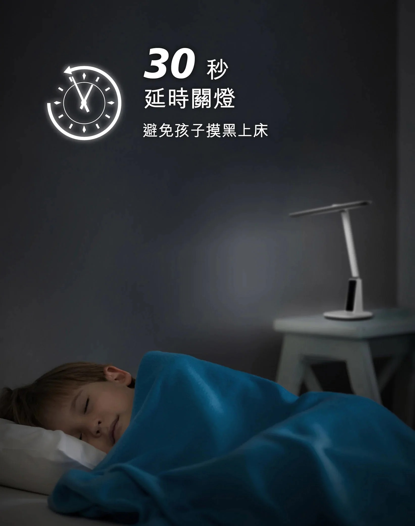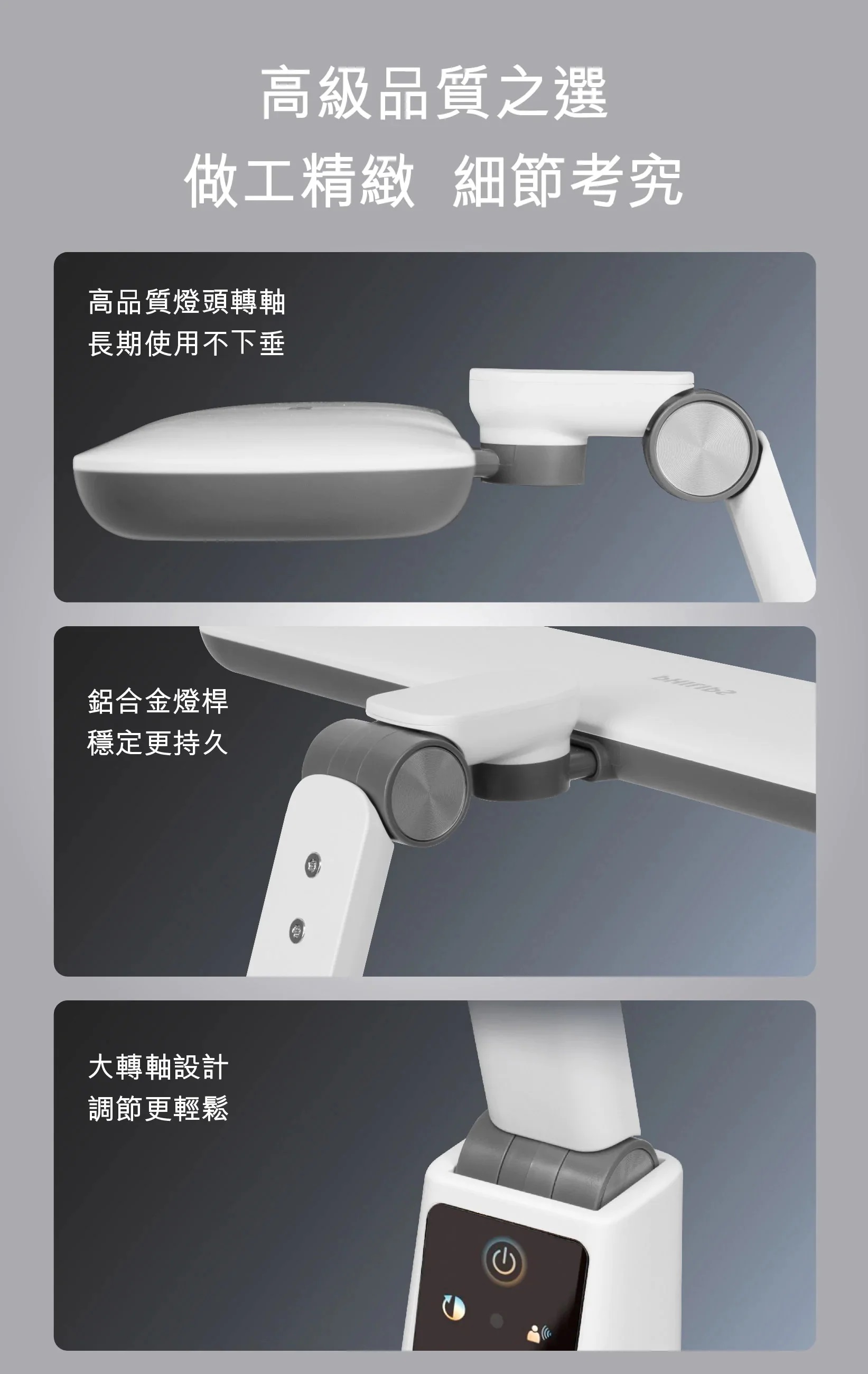 - T 型燈頭採用 二維懸臂結構,適配寬書桌,可將中心區光線平推至孩子眼前。
