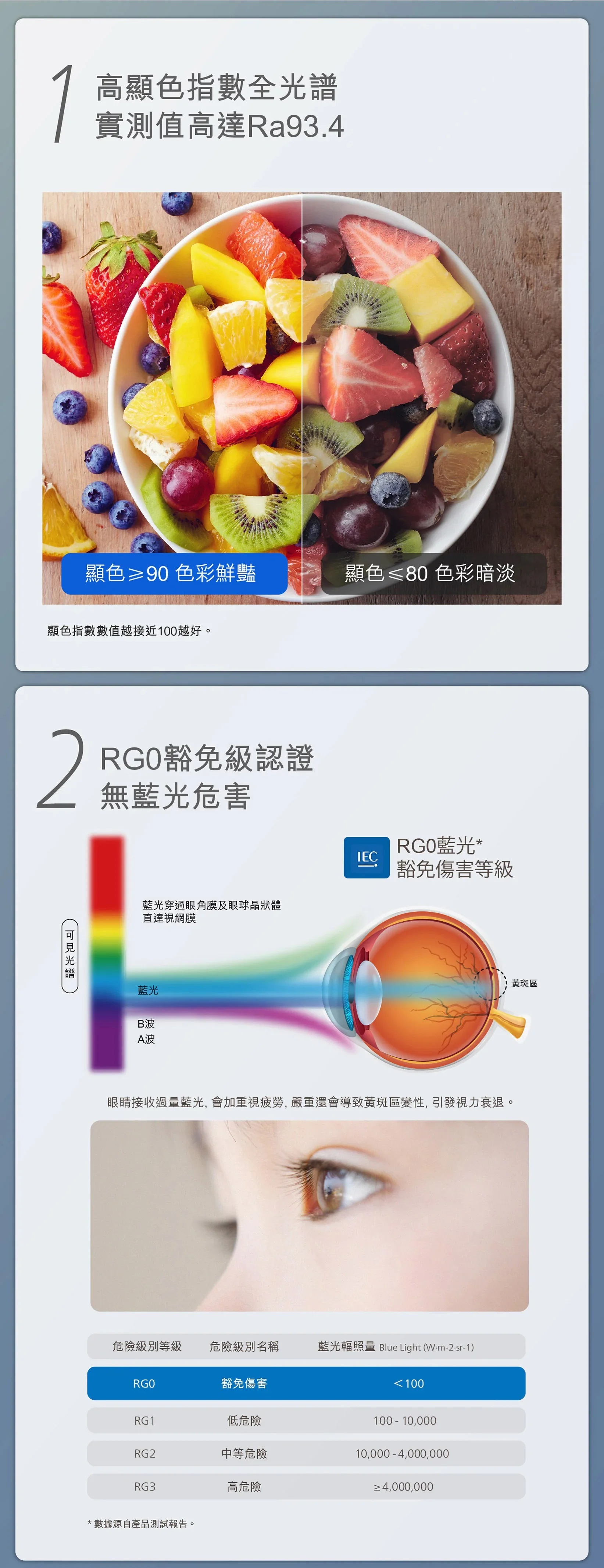 - 搭載高顯指全光譜燈珠,藍光輻更低,達 RG0 豁免級。