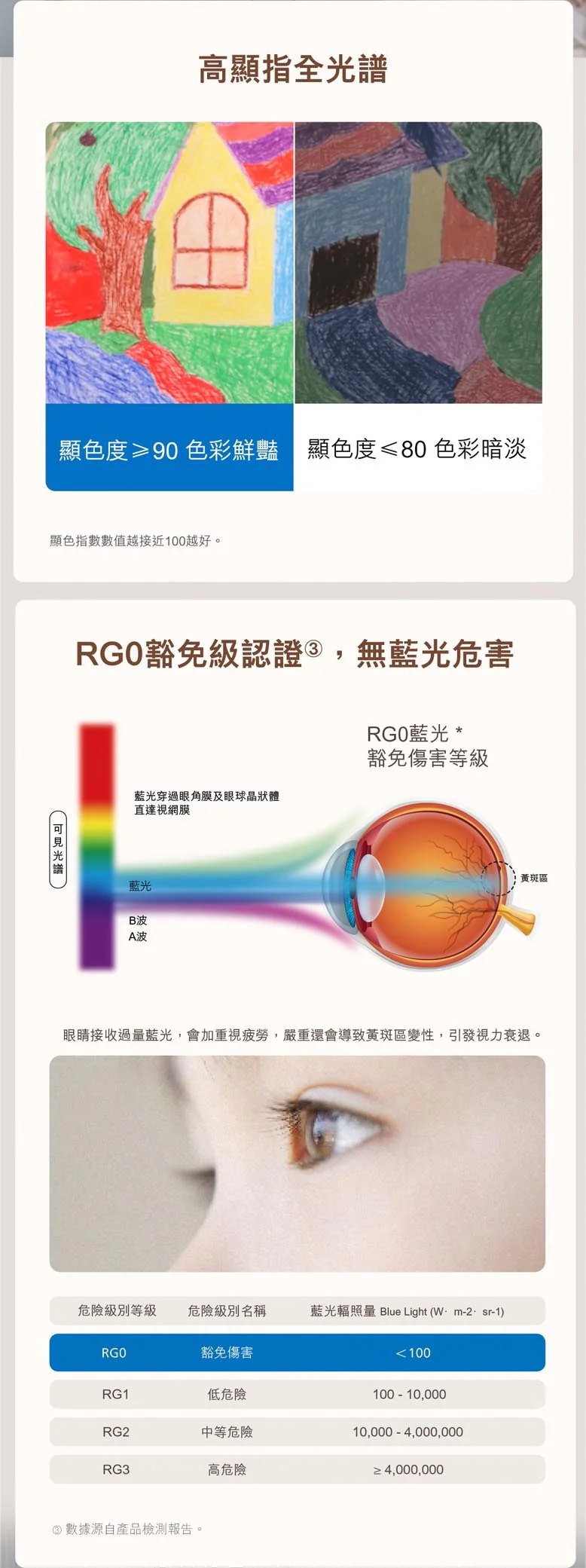 - • 直下式設計加微稜鏡擴散罩,令照度均勻度達到國AA級別(40cm高度)。