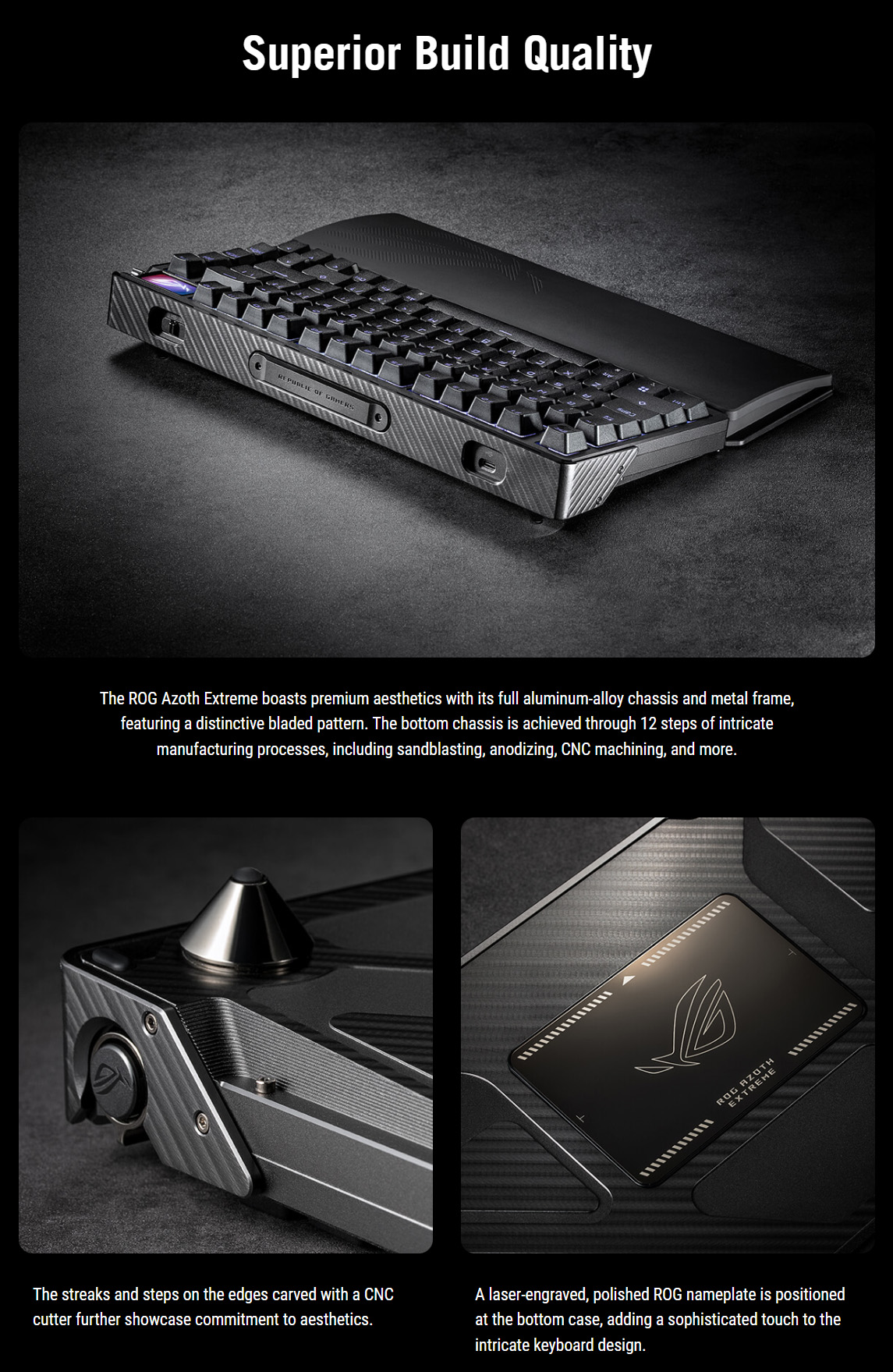 ROG Azoth Extreme 75% 遊戲定製鍵盤,採用全鋁合金機箱、碳纖維定位板、可調節墊圈固定座、帶三向控制旋鈕的全綵 OLED 觸控式螢幕、擴充套件腕託、磁性腳墊、採用 2.4 GHz SpeedNova 技術的三模連線、可熱插拔的預潤滑 ROG NX 機械開關以及 Mac 支援。