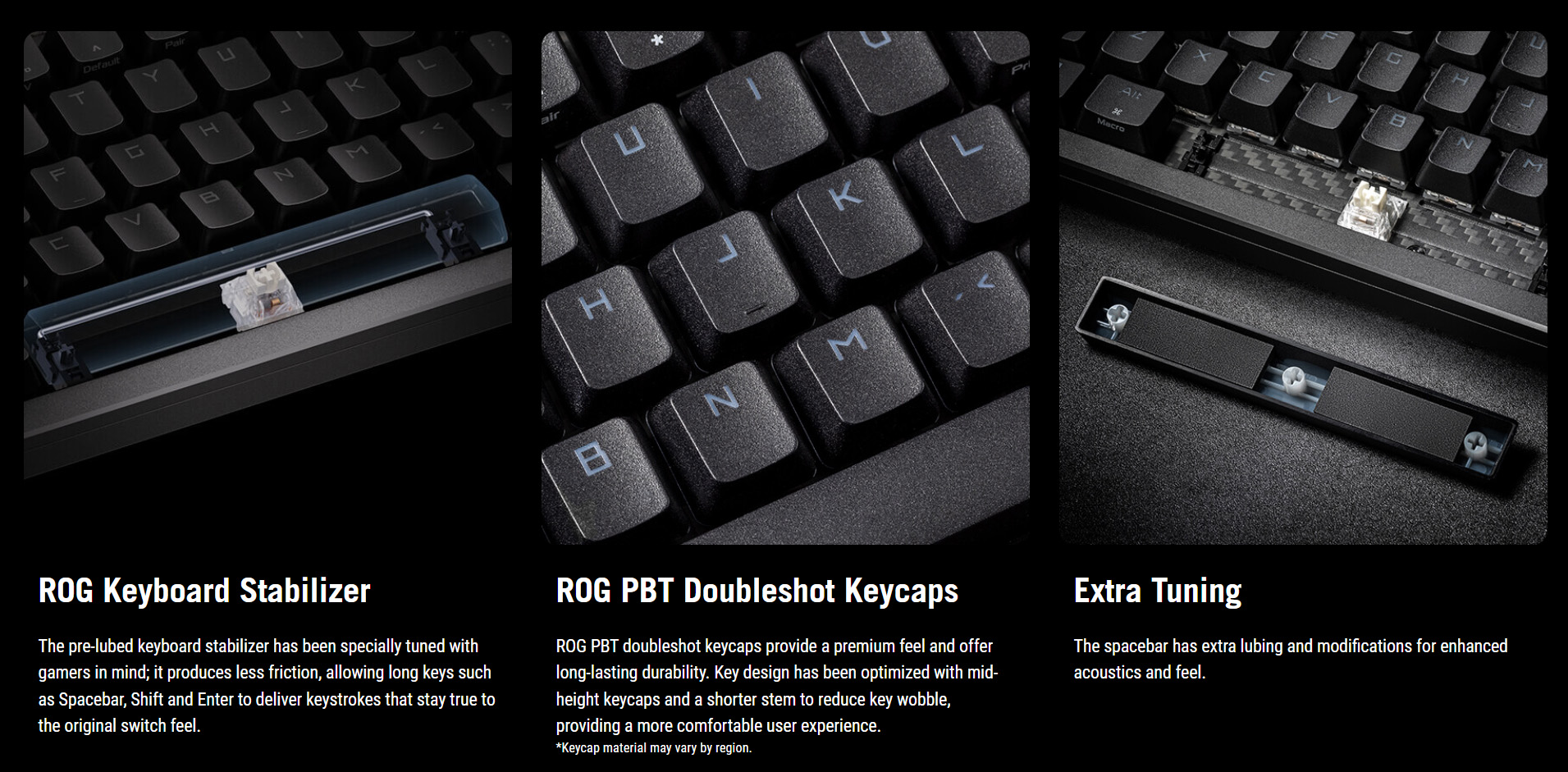 - 增強打字型驗: 預潤滑的 ROG NX 機械開關和消音泡沫可提供更流暢的按鍵和更好的聲學效果。