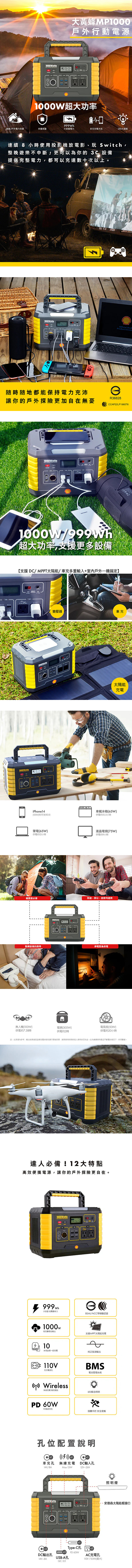 - AC輸出220V-240V/50Hz, 1100W(Max1500W),正弦波輸出電源乾淨穩定
