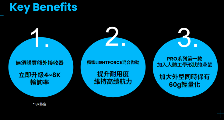 - 支援最高達4kHz的回報率,無需額外配件即可實現超低延遲體驗(技術評估後可支持8kHz),確保每一個動作都快速響應。