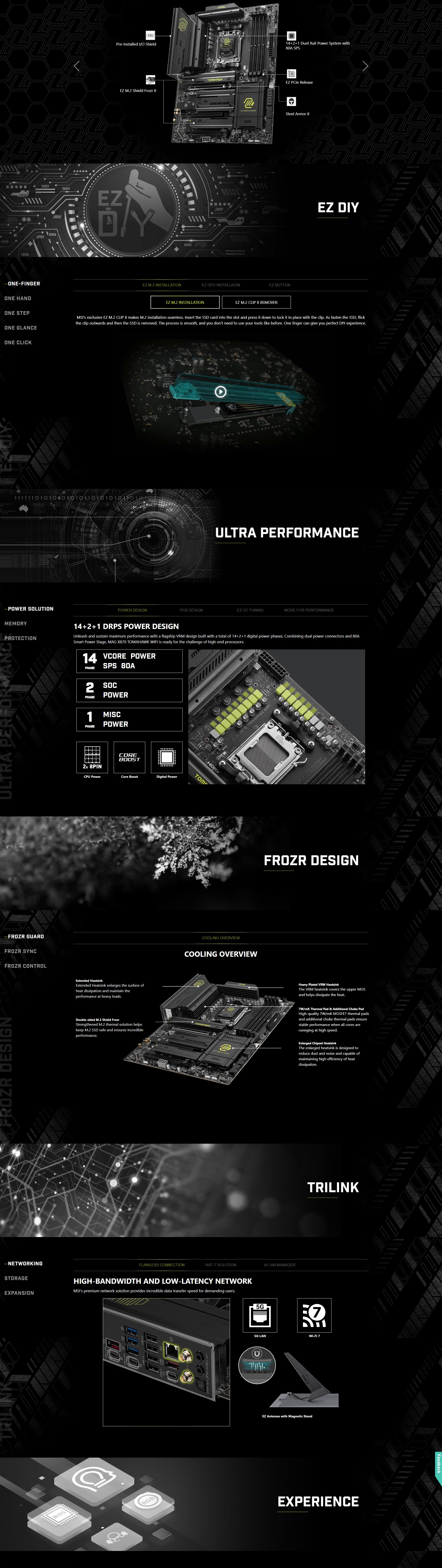 - Frozr Guard: Extended Heatsink, MOSFET thermal pads rated for 7W/mK, additional choke thermal pads and EZ M.2 Shield Frozr II are built for high performance system and non-stop experience