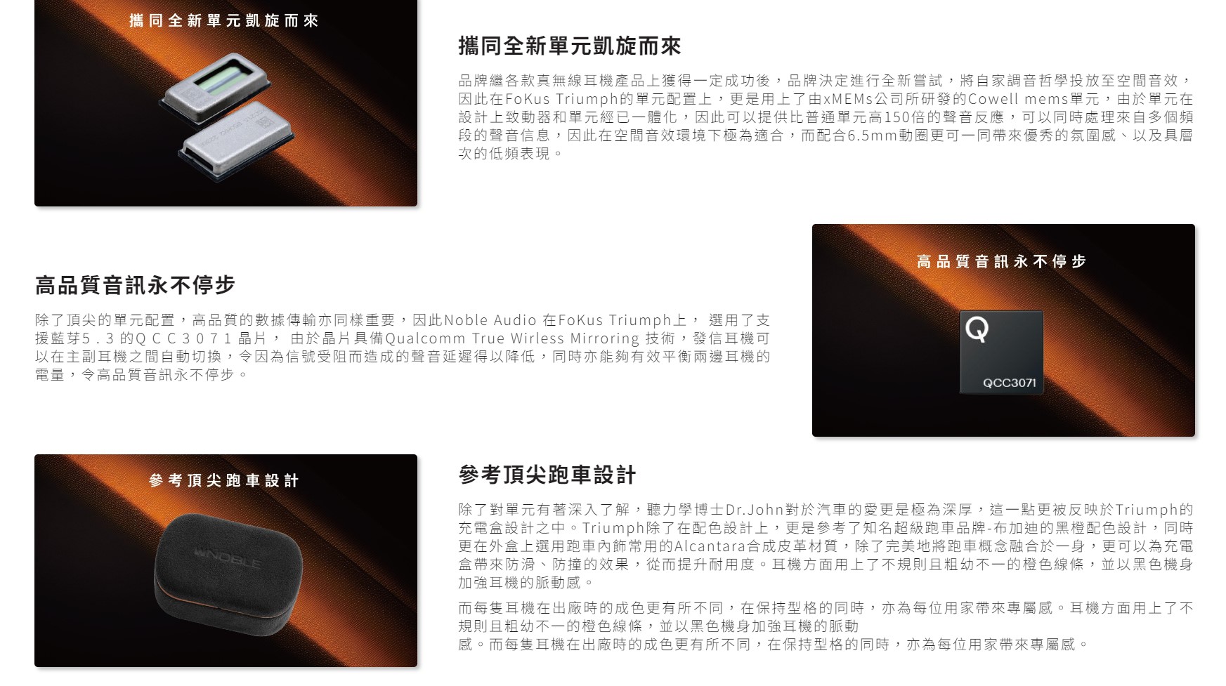 除了發燒耳機市場,美國知名耳機品牌Noble Audio,在藍牙耳機市場上的表現亦同樣出色。繼FoKus Pro、FoKus Mystique、FoKus Prestige 等優秀型號在市場上屢受好評後,品牌更決定再下一城,用上更高效的mems單元技術,配合6.5mm動圈,打造出具豐富沉浸感的FoKus Triumph。同時更以跑車內飾常用的Alcantara合成皮革材質,作為充電盒外殼,將極尚美學與完美音色完美融合。