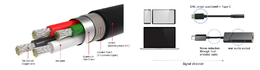 此外,導體包覆著鋁膜屏蔽層,進一步阻絕噪音干擾,並在周圍設置了額外的屏蔽層,針對音頻中最常見的噪音問題進行進一步減噪。同時,鍍錫銅線的使用進一步減少了對音質的干擾。最後,在TPE護套的基礎上添加了織物套,提升了傳輸線的耐用性和實用性,同時為其賦予完美的外觀美感。