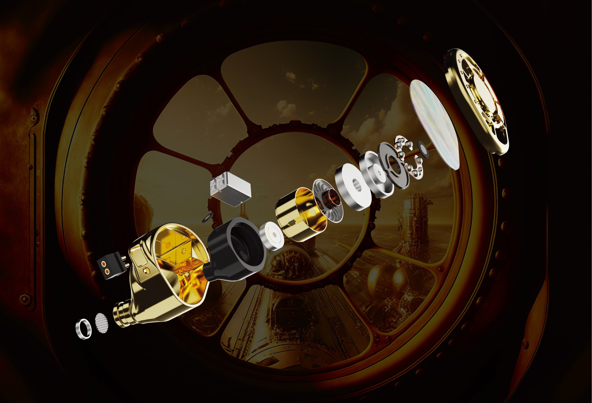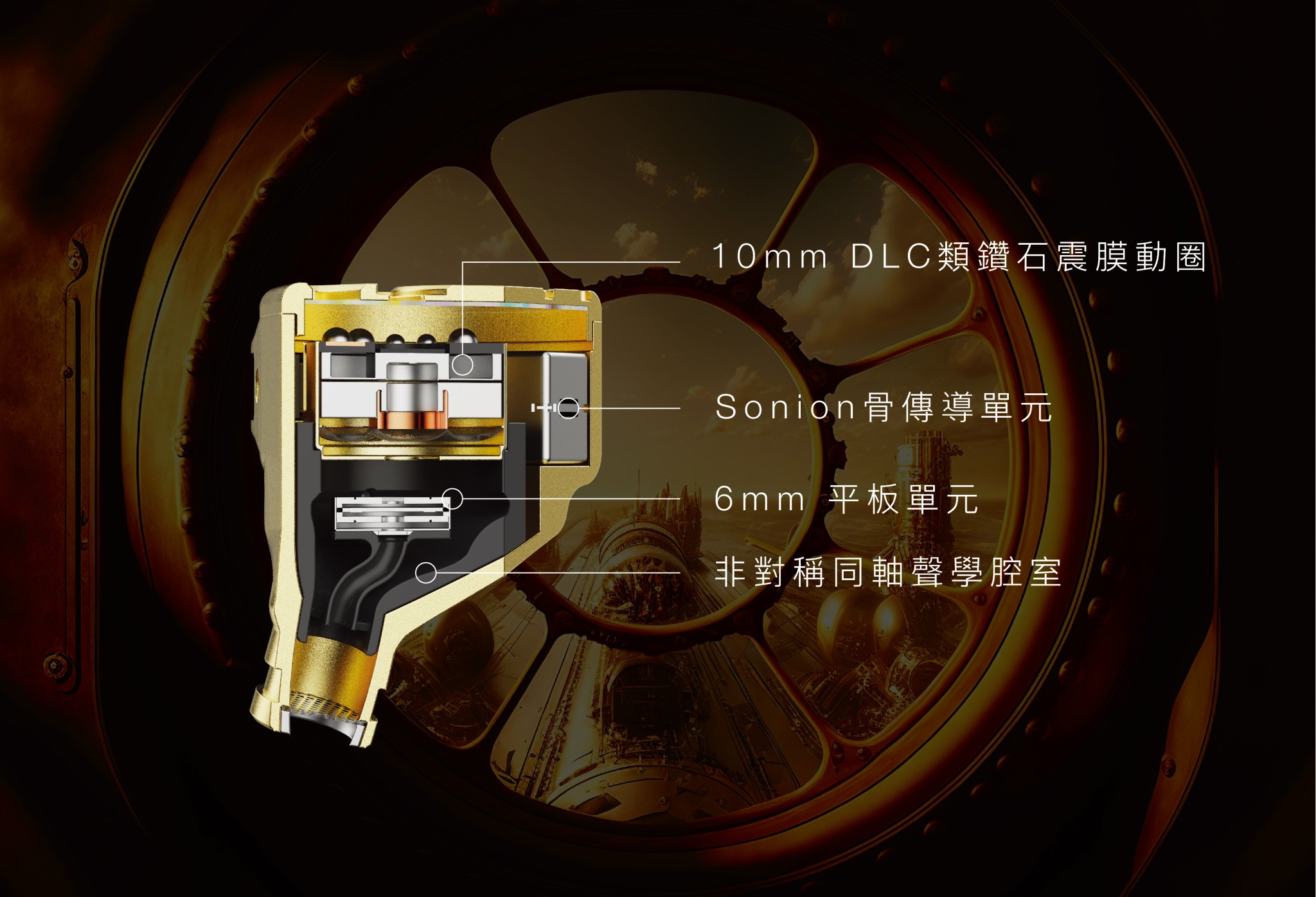 Nautilus身上的Sonion骨傳導單元、6mm平板單元、以及10mm DLC類鑽石震膜動圈,能夠全方位銜蓋所有頻段,可以精準捕捉每個聲音細節。同時為了進一步追求更深邃的背景,以及實現出更高還原的低頻細節,動圈外殼上亦採用鍍金黃銅為材,以抑制單元運作時的諧震。由於三款單元在空間感、還原度上都擁有不同優點,因此在共同運作時,Nautilus便可以各取不同單元的優勢,令用家可以感受到更多的音樂細節