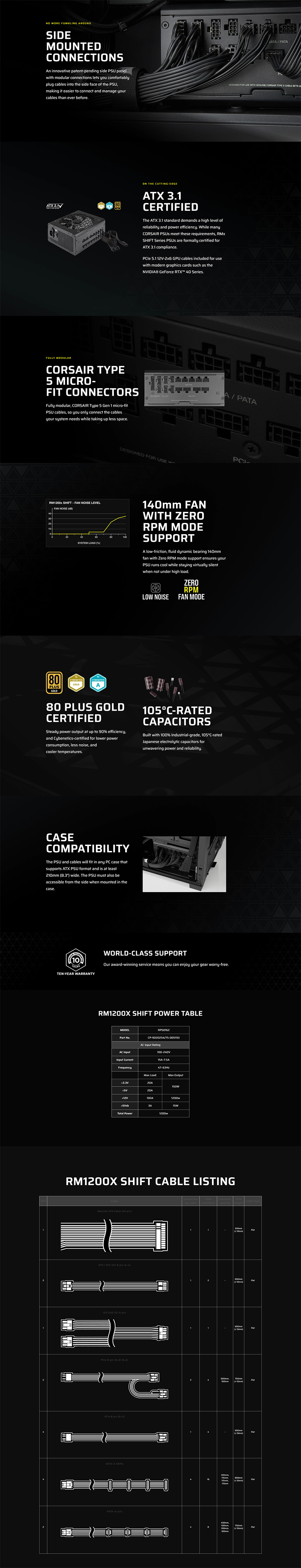 CORSAIR RMx SHIFT Series fully modular power supplies boast a revolutionary patent-pending side cable interface to keep all your connections within easy reach, for exceptionally convenient 80 PLUS Gold efficient power.
