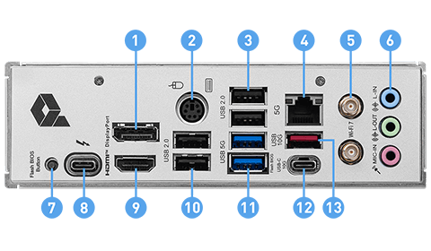| Onboard Graphics | 1x HDMI™ Support HDMI™ 2.1, maximum resolution of 4K 60Hz* 1x DisplayPort Support DisplayPort 1.4, maximum resolution of 4K 60Hz* 1x Type-C DisplayPort Thunderbolt™ 4 port, supporting DisplayPort 1.4 over USB Type-C®, with a maximum resolution of 4K 120Hz / 8K 60Hz* *Available only on processors featuring integrated graphics. Graphics specifications may vary depending on the CPU installed. |