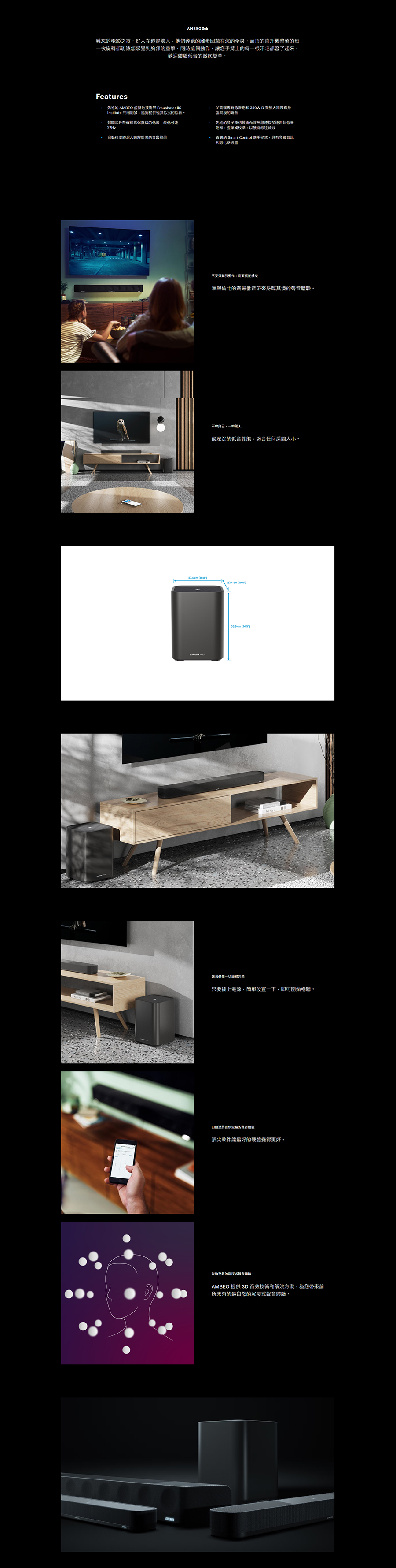- AMBEO 虛擬化技術:最先進的技術提供極深沉的低音,帶來自然逼真的聲音,支持完整的家庭影院體驗。
