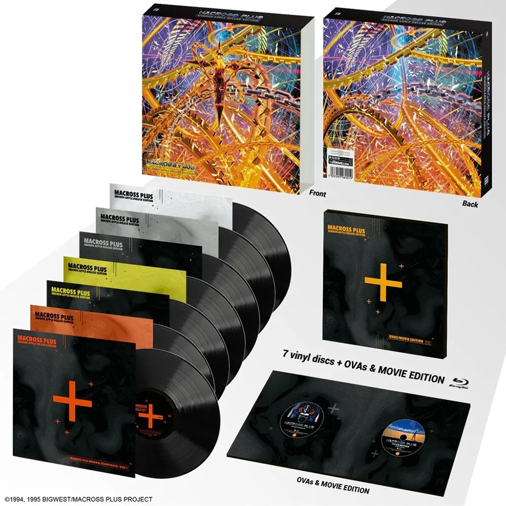 Presented over a set of seven 12" vinyl LPs and comprising four collected soundtracks, this Deluxe Edition also contains Macross Plus itself on Blu-ray in both its theatrical and four-part OVA formats, allowing you to fully appreciate the majesty of the music within its native setting.