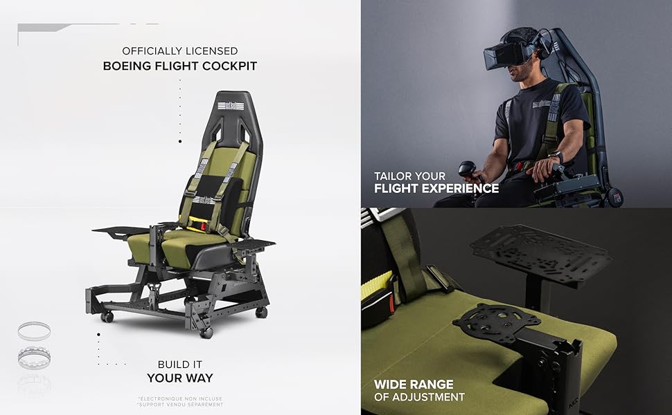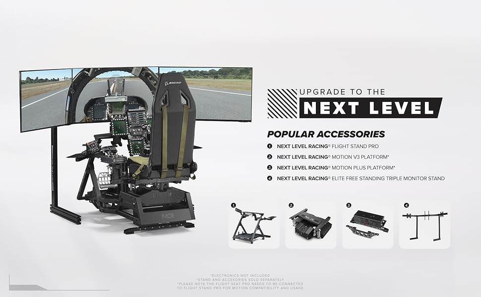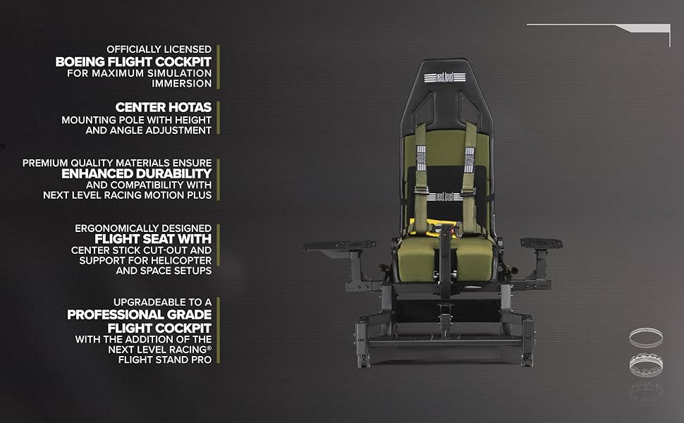 • Officially licensed Boeing flight cockpit for maximum simulation immersion; Upgradeable to a professional grade flight cockpit with the addition of the Next Level Racing Flight Stand Pro