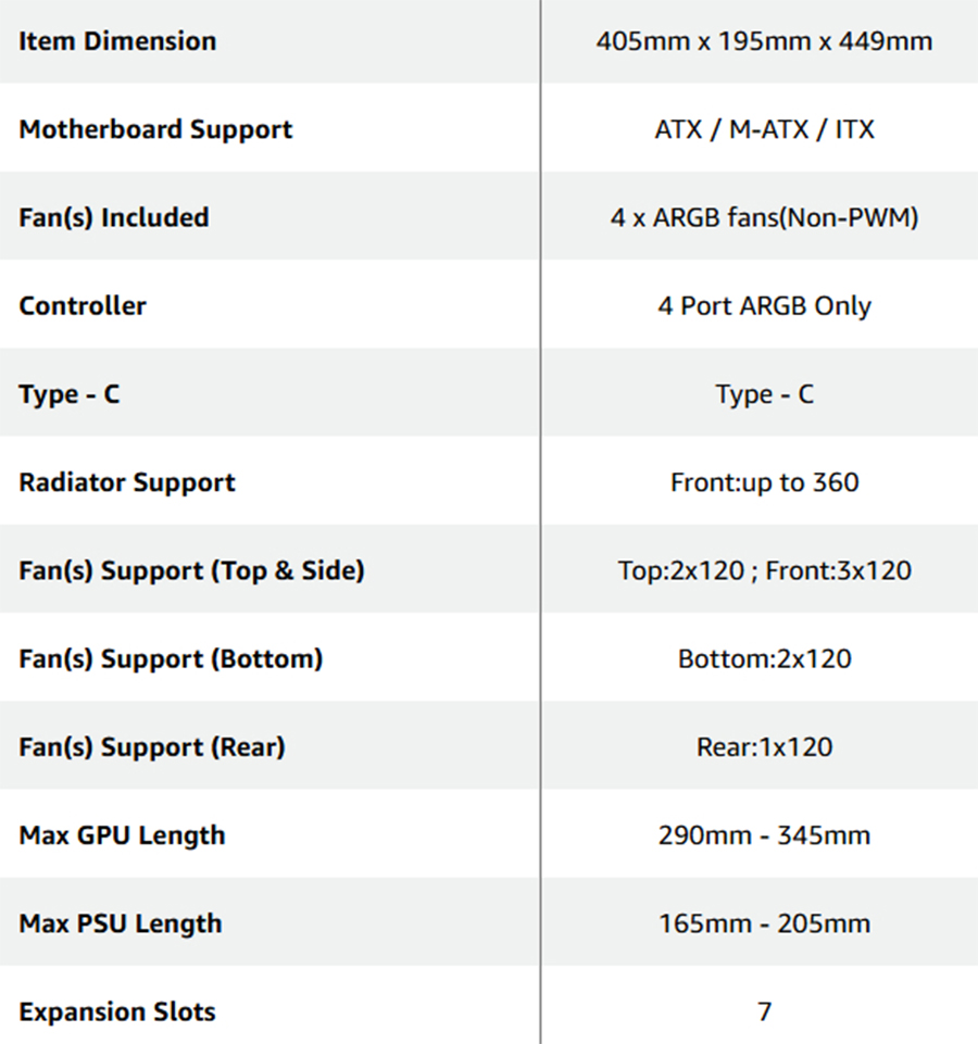 - 【預先安裝 4 × 120 公釐 ARGB 風扇】 3 針+3 針 H12 ARGB 風扇(風扇速度:1000 RPM)。 包括一個 ARGB 控制器,配有四個 3 針接頭和 1 對 3 針風扇分離線,可實現主機板同步照明效果,並使電纜管理變得簡單。