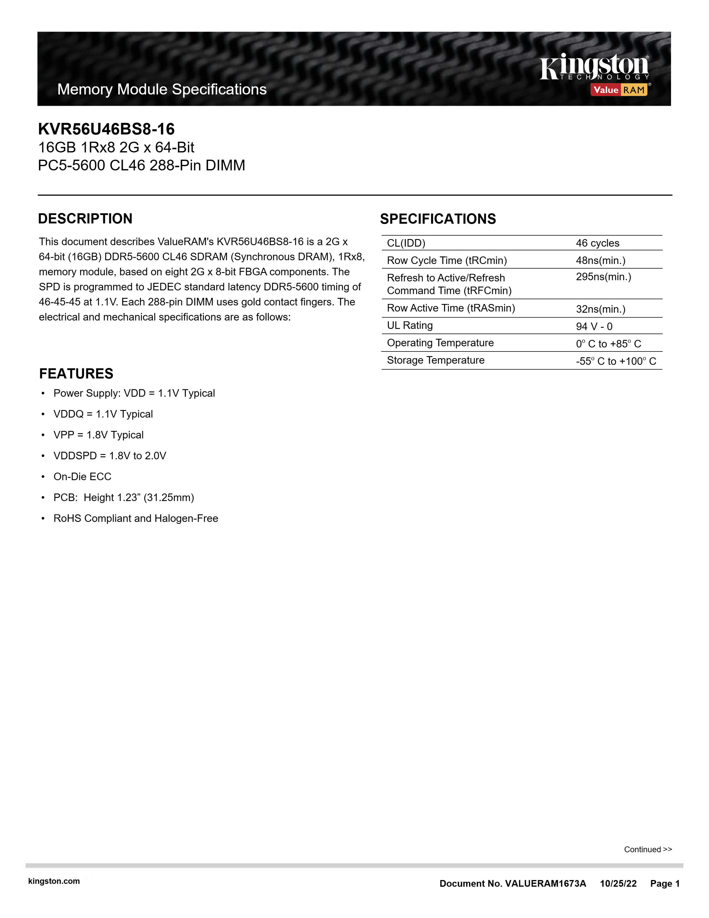 Kingston ValueRAM 16GB*1 DDR5-5600 CL46 LODIMM 記憶體(KVR56U46BS8-16)