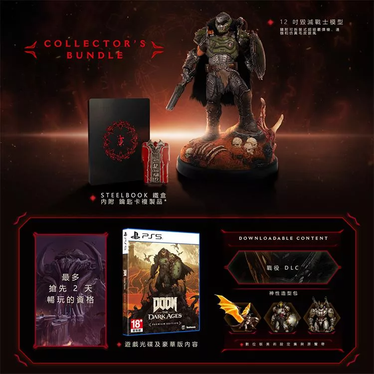 預購《毀滅戰士:黑暗時代》 PS5 典藏版或 PS5 標準版實體遊戲片,即可獲得預購限定特典「虛空毀滅戰士造型」;玩家將於收到商品時額外獲得造型。