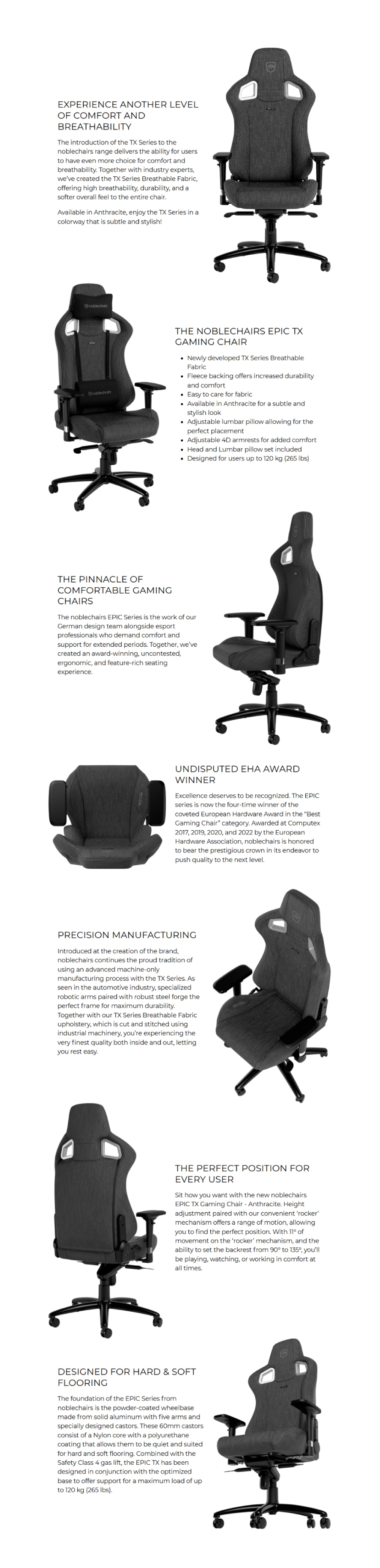 - 體驗極致的遊戲與辦公椅,選擇 EPIC TX 系列 與透氣面料設計。