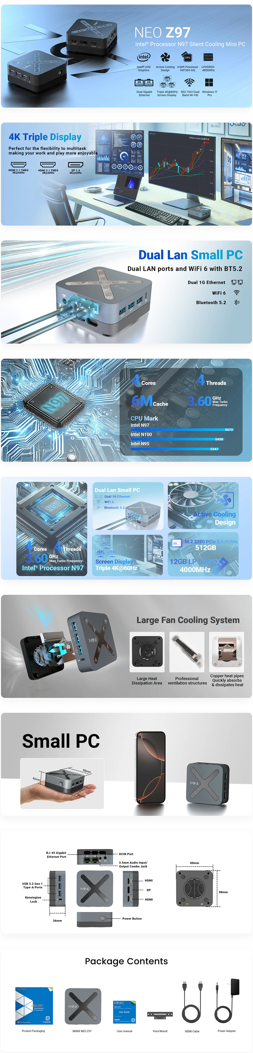 搭載 Intel® Processor N97(6MB 快取,最高 3.6 GHz),MINIX NEO Z97 迷你電腦提供流暢的多工處理能力,應對各種需求嚴苛的應用程式。支援同時連接三個顯示器,包括 兩個 HDMI 2.0(4K @ 60Hz) 和 一個 DisplayPort 1.4(4K @ 60Hz),為生產力、娛樂及多螢幕工作流程帶來極致便利。