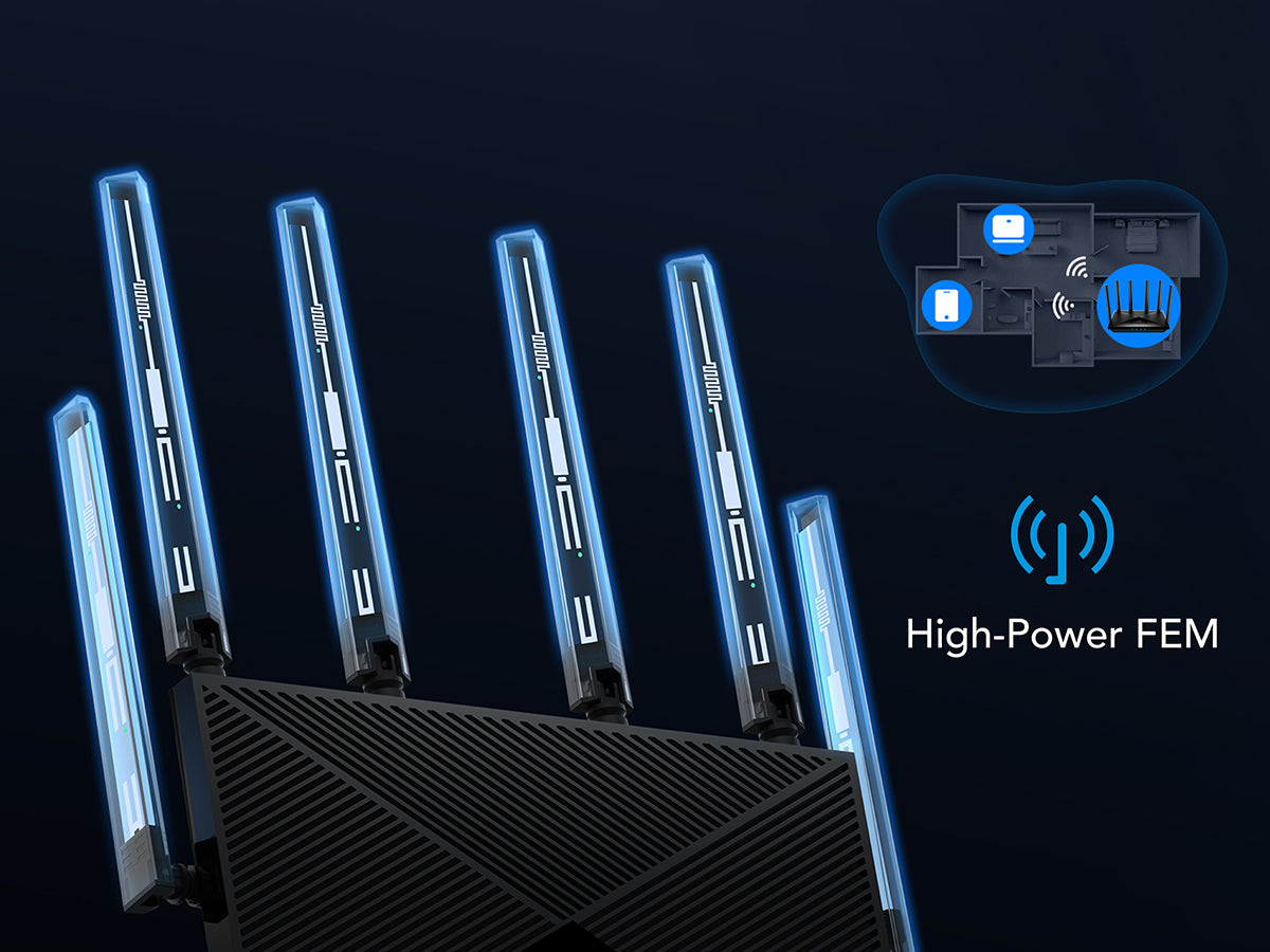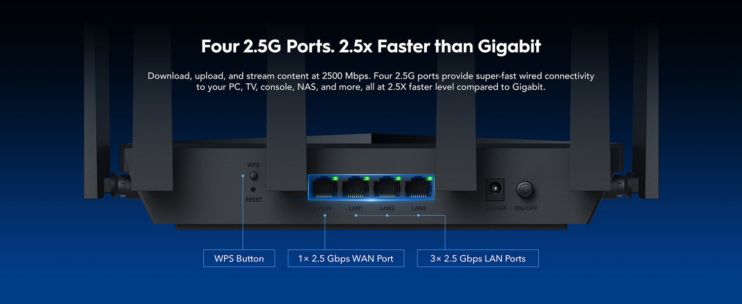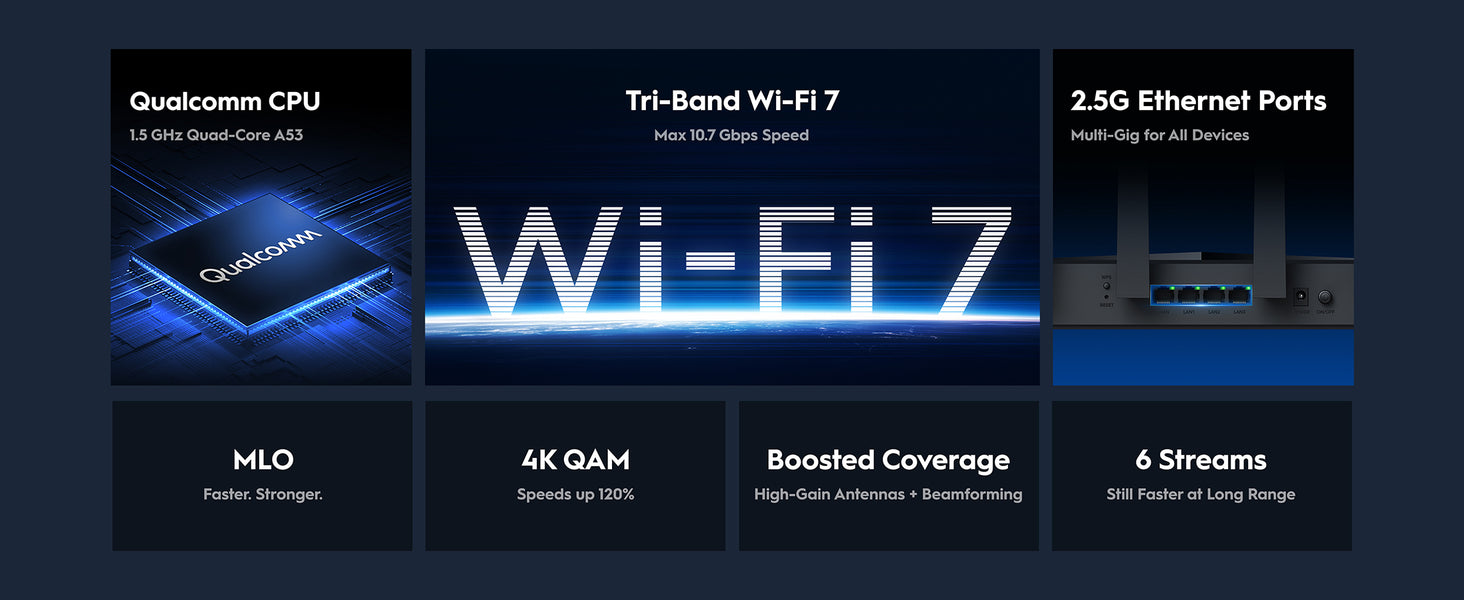 三頻 WiFi 7 路由器,總速度為 10.6 Gbps,具有四個 2.5G 端口,適合延遲敏感、速度要求高的大規模場景。