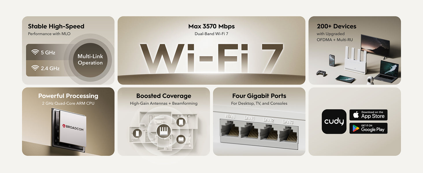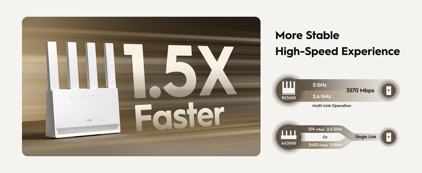 一款雙頻 WiFi 7 路由器,提供 MLO 速度聚合功能,非常適合延遲敏感、速度要求較高的場景。