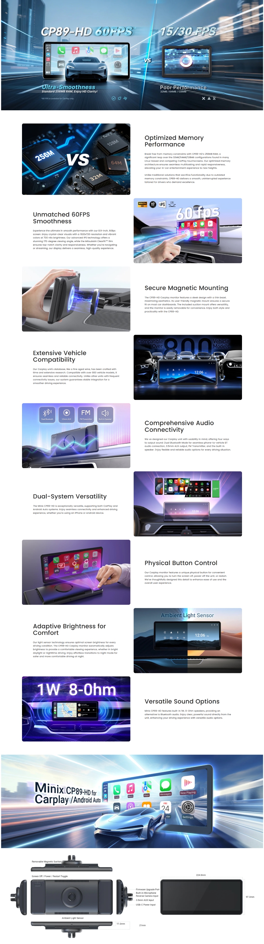 The MINIX CP89-HD CarPlay monitor delivers unparalleled smoothness with up to 60FPS refresh rate, ensuring lag-free video playback and navigation. The 8.9-inch high-definition screen, with 700 cd/m² brightness, offers crystal-clear visuals. The CP89-HD combines advanced IPS technology and Mitsubishi Clearfit™ film to provide a 170-degree viewing angle with top clarity and responsiveness, ensuring a seamless, high-quality display experience for navigation and streaming.
