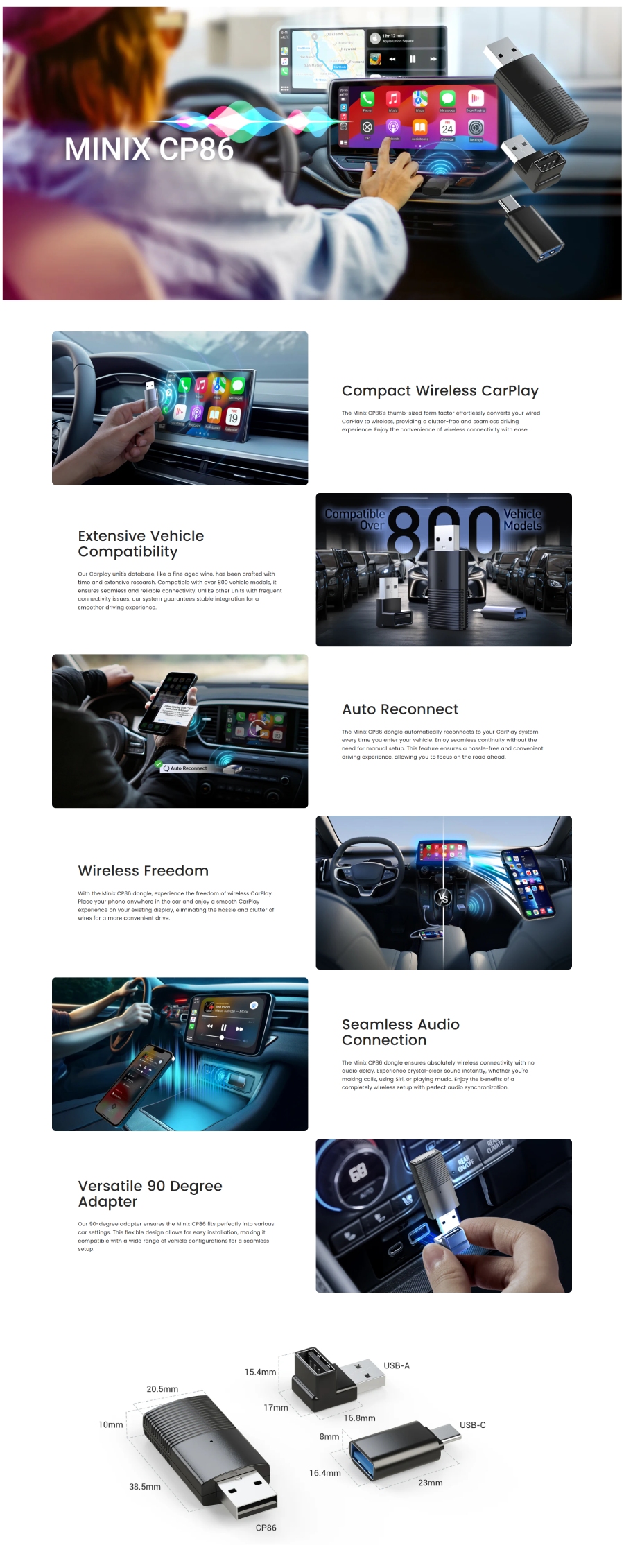 The MINIX CP86 wireless CarPlay adapter boasts an ultra-compact and sleek design, enabling you to easily install it without occupying much space in your vehicle. This CarPlay wireless adapter blends seamlessly into your vehicle's interior, offering a clean and minimalist look without clutter. Its 90-degree adapter design ensures the CP86 fits perfectly into various car settings. This versatile design allows for easy installation and is compatible with vehicle configurations, providing a convenient plug-and-play experience.