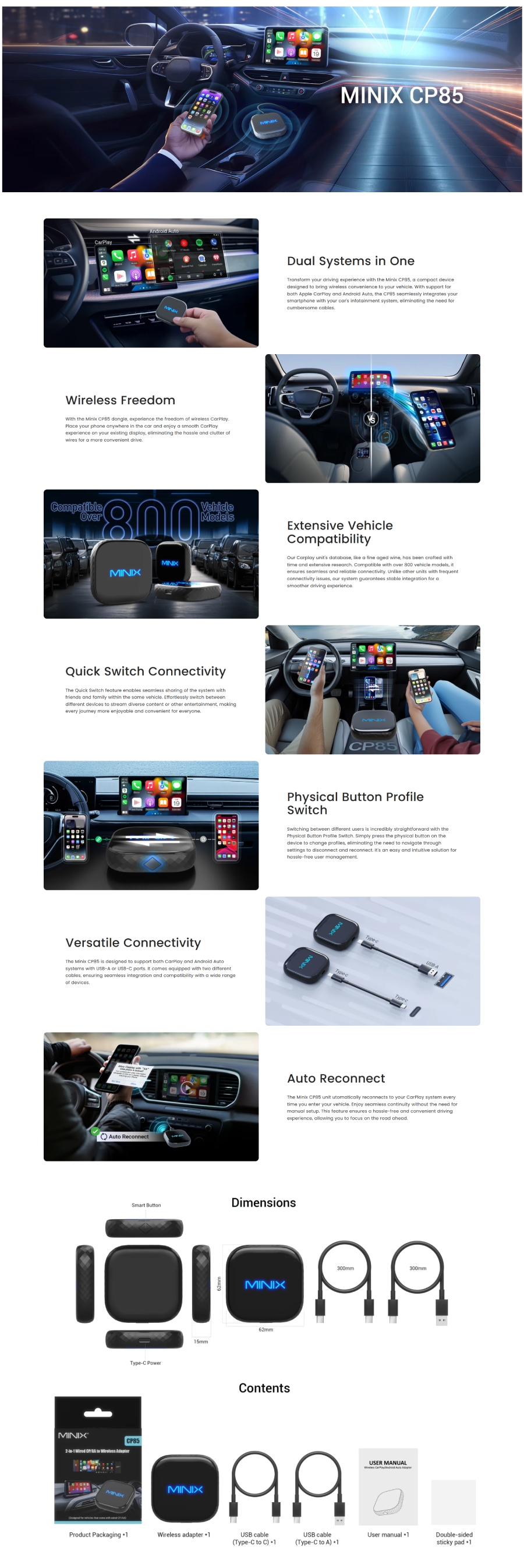The Minix CP85 is a cutting-edge device that seamlessly transforms your vehicle's infotainment system. Supporting both Apple CarPlay and Android Auto, the CP85 ensures effortless wireless connectivity, eliminating the need for cables. Its compact design offers a clutter-free driving experience, while the Quick Switch feature allows easy sharing with multiple users. The Physical Button Profile Switch makes switching between user profiles intuitive and hassle-free. Additionally, the CP85 supports both USB-A and USB-C ports, coming with two different cables for versatile compatibility. Enhance your driving experience with the Minix CP85's innovative and user-friendly features.