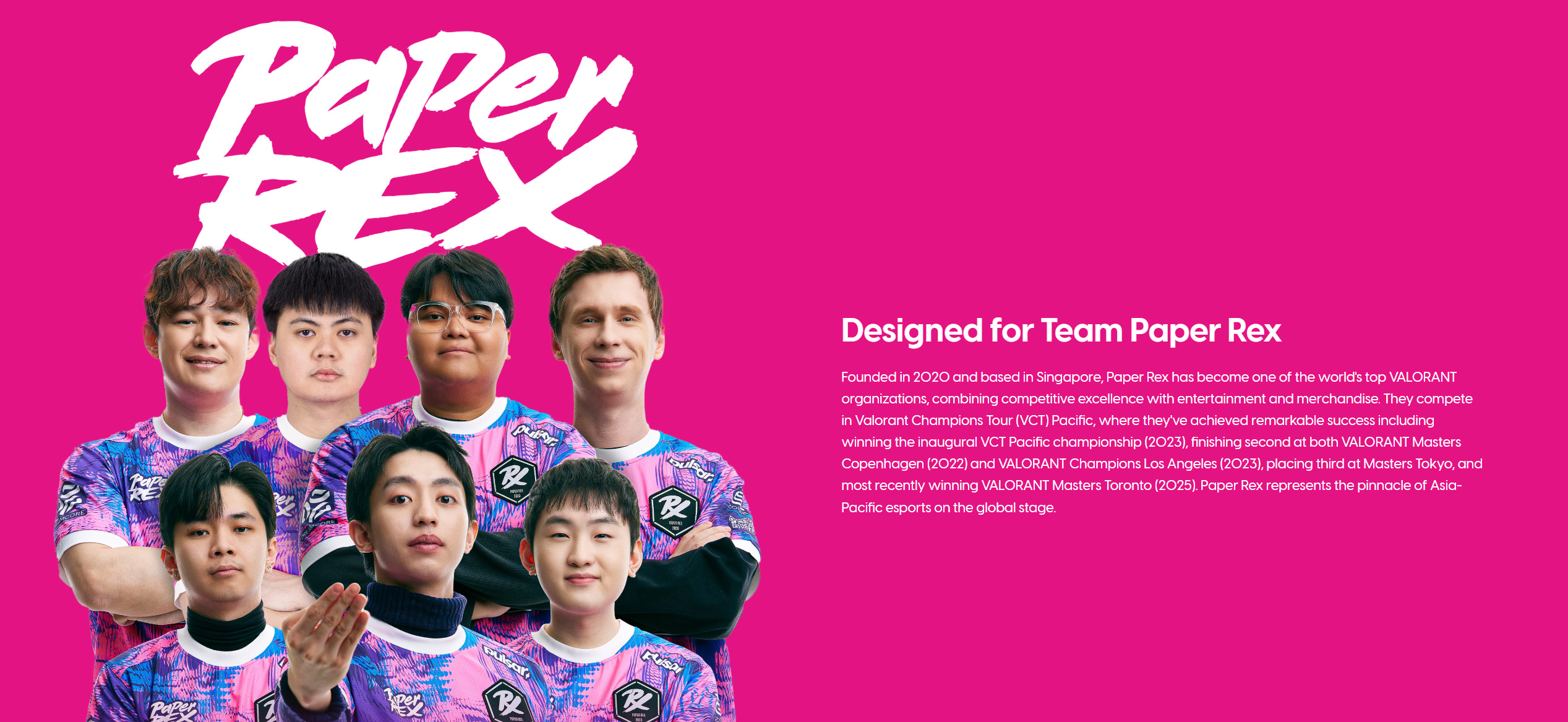 Paper Rex(簡稱 PRX)於 2020 年在新加坡成立,短短數年間迅速躍升為全球頂尖電競戰隊之一,傲視群雄的成績包括勇奪 VCT 太平洋聯賽首屆冠軍、勇奪 Champions LA 亞軍、Masters Tokyo 季軍,最近更於成都舉行的 2024 Radiant 邀請賽中封王。