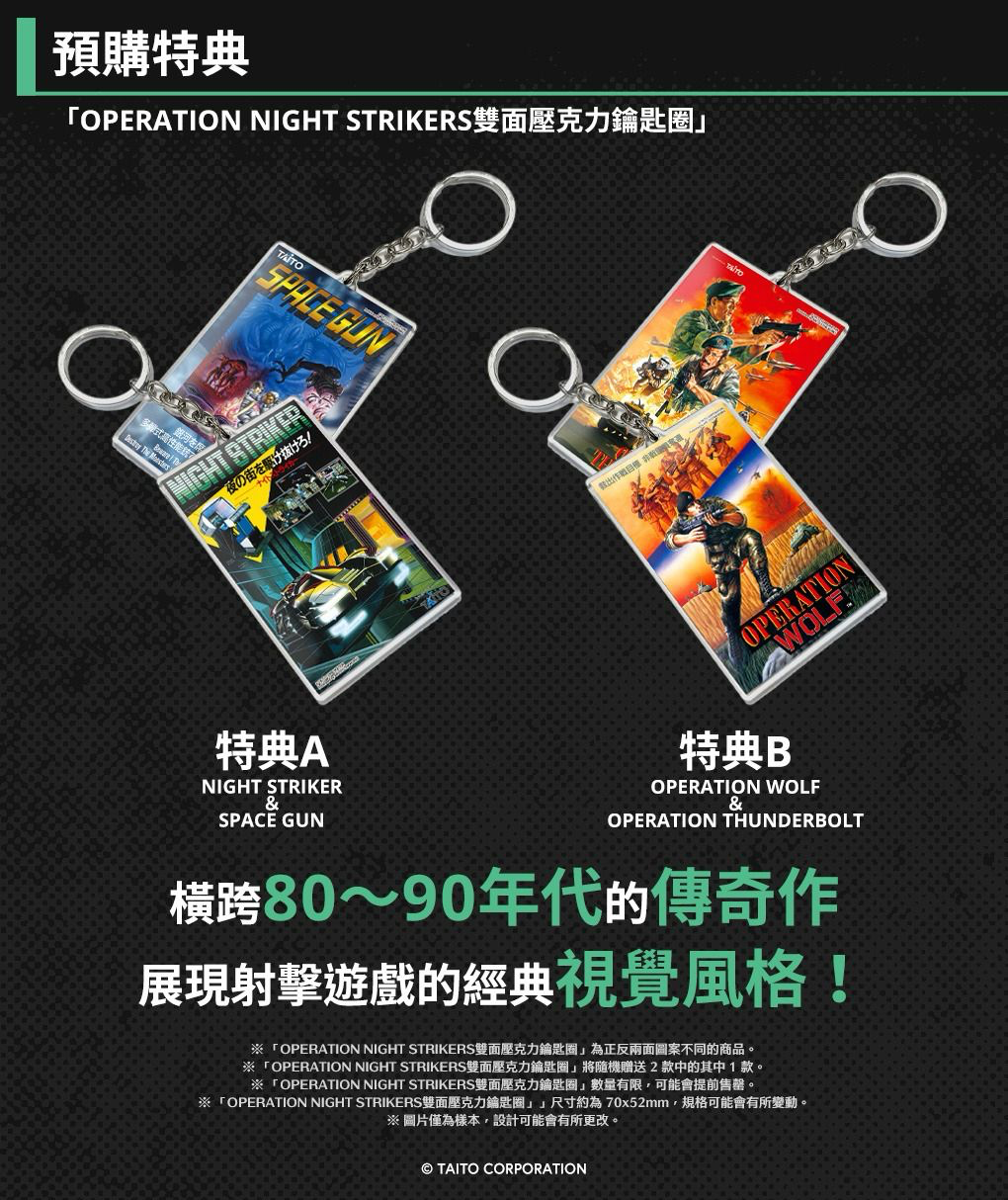本作收錄以下遊戲 : 《OPERATION WOLF》/ 《OPERATION THUNDERBOLT》/ 《NIGHT STRIKER》/ 《SPACE GUN》