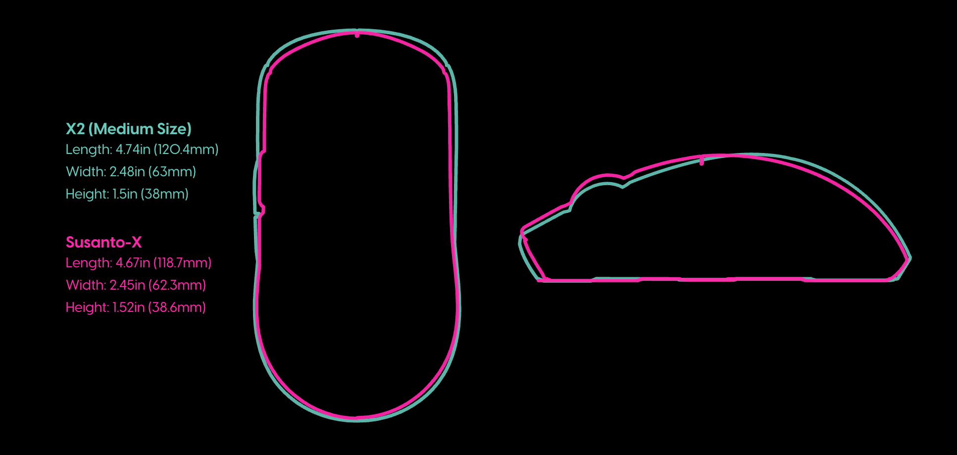 Both the Susanto-X and X2 feature an ergonomically symmetrical design when viewed from above, offering a natural fit that enhances comfort and control. Compared to the X2, the Susanto-X has a narrower shape, making it more compact and agile for precise handling.
