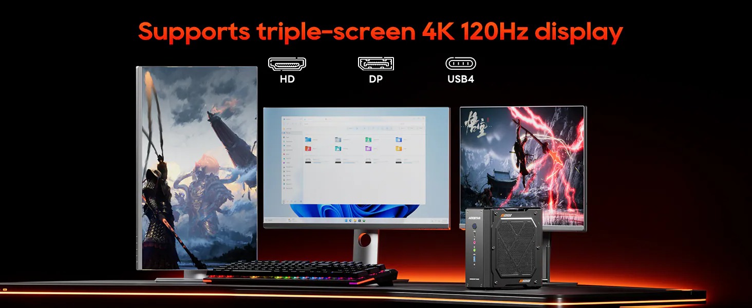 - HDMI 2.0 (4K@60Hz), DP 1.4 (4K@120Hz), USB4 (4K@120Hz)