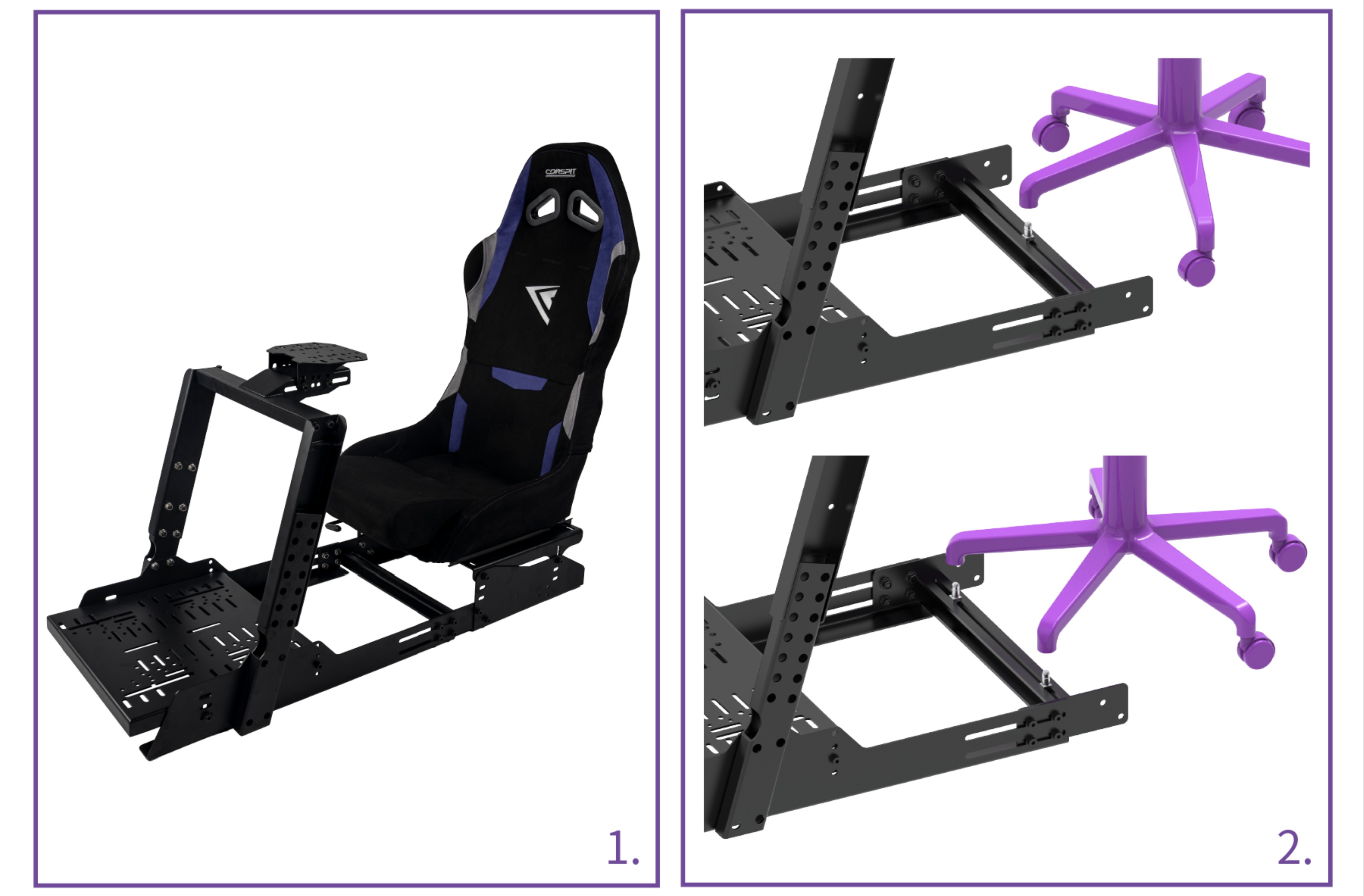 雙模式設計,可將電腦椅腳緊鎖在車架上,成為簡易的wheelstand使用。亦可加配後段座椅部份,成為標準賽車支架。Conspit GT-S雙模式輕量化賽車支架均能輕鬆應付任何使用場景。