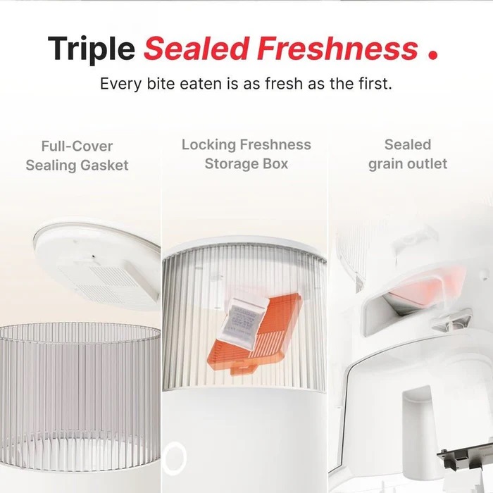我們的餵食器的三層新鮮度鎖確保您的寵物食物保持清脆可口。全罩密封墊圈可防止空氣進入,乾燥劑袋保持乾燥,封閉的內部穀物出口可防止污染。