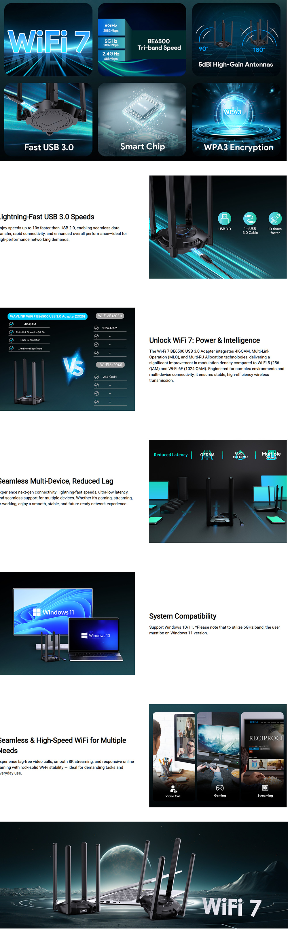 - -WiFi 7 achieves a tri-band concurrent speed of up to 6500Mbps(2.4GHz 688Mbps + 5GHz 2882Mbps + 6GHz 2882Mbps).